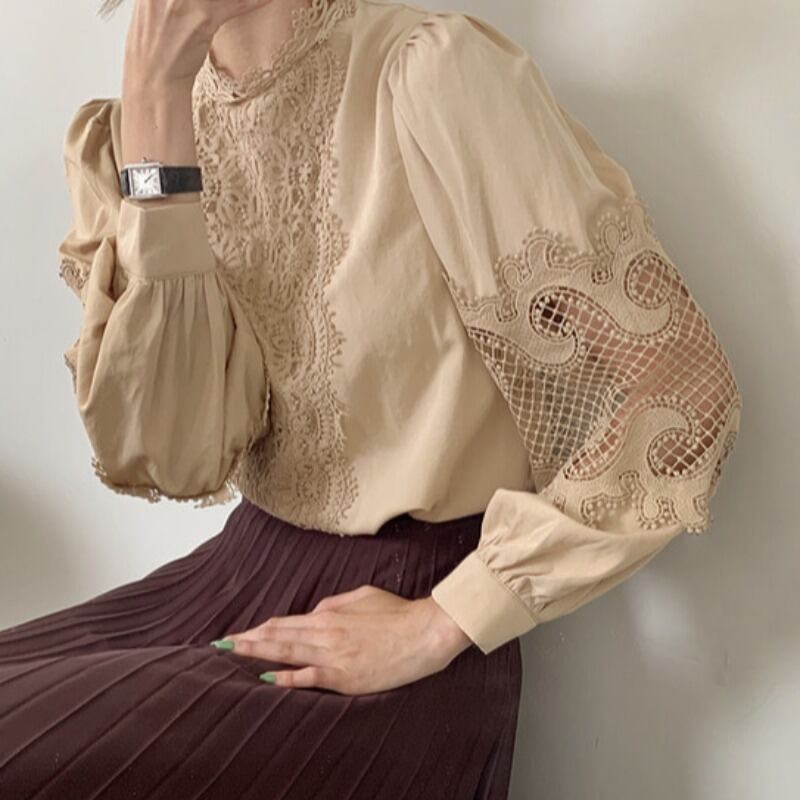 オータムスタンダードスリーブシャツ ルーズプルオーバー ラウンドネックトップス レース ランタンスリーブ レトロ 秋物 Oネック ICC_レディース3152425