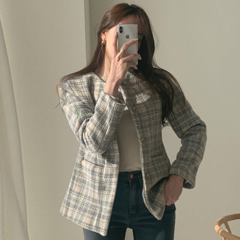 スタンダード格子柄ショートジャケット スリムカジュアルクロップトップ トップス レトロ ICC_レディース9178868