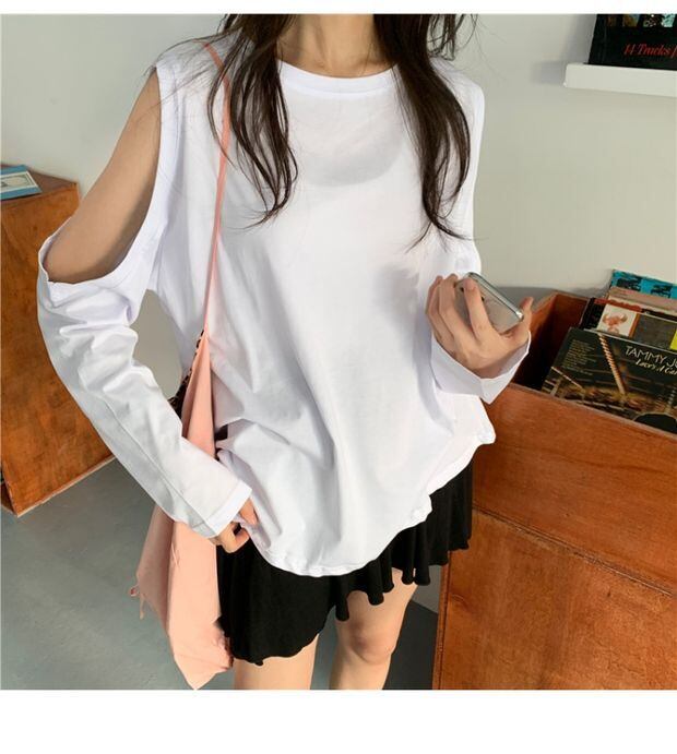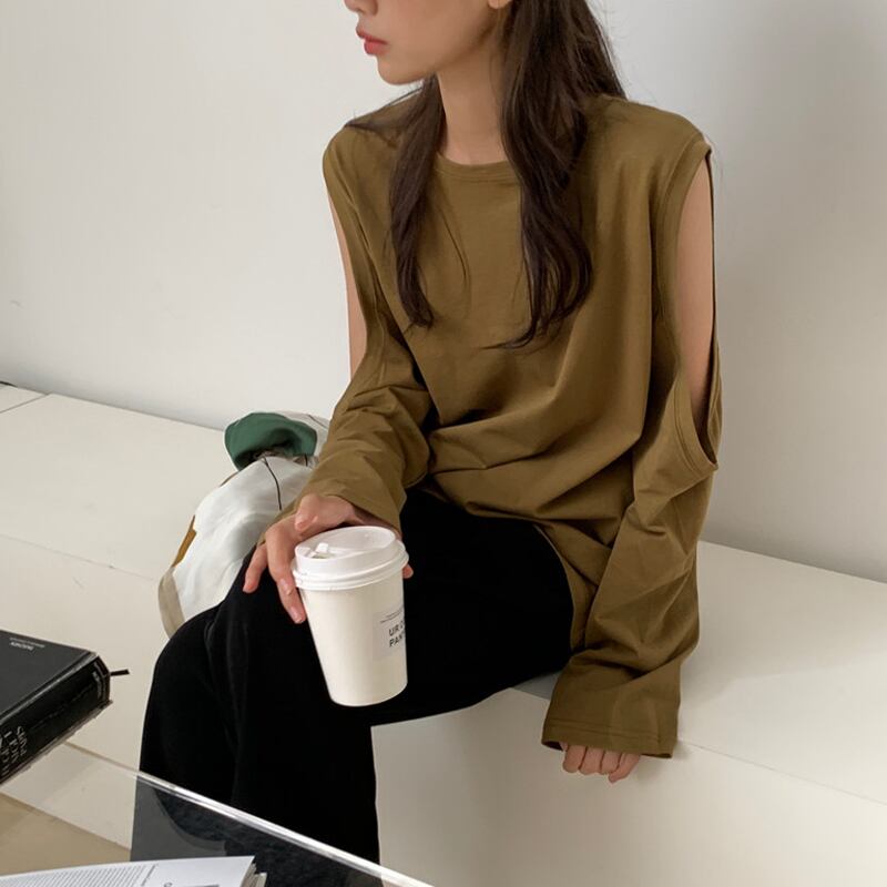 オータムスタイルソリッド カラーシャツ ルーズTシャツ ロング かわいい 秋物 ソリッドカラー 左左右右1790324646