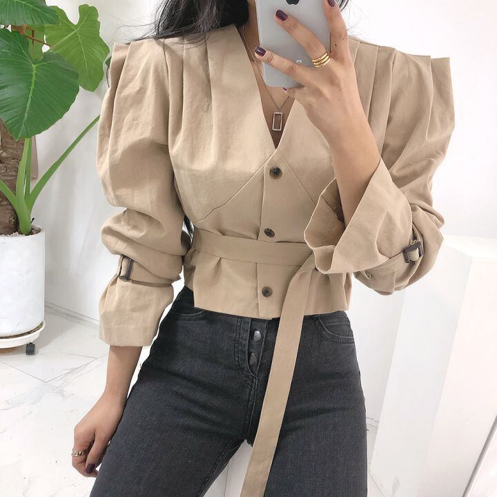 オータムスタイルスタンダードVネックショート長袖スリーブシャツ レディース ロング レトロ 秋物 ICC_レディース22179315261