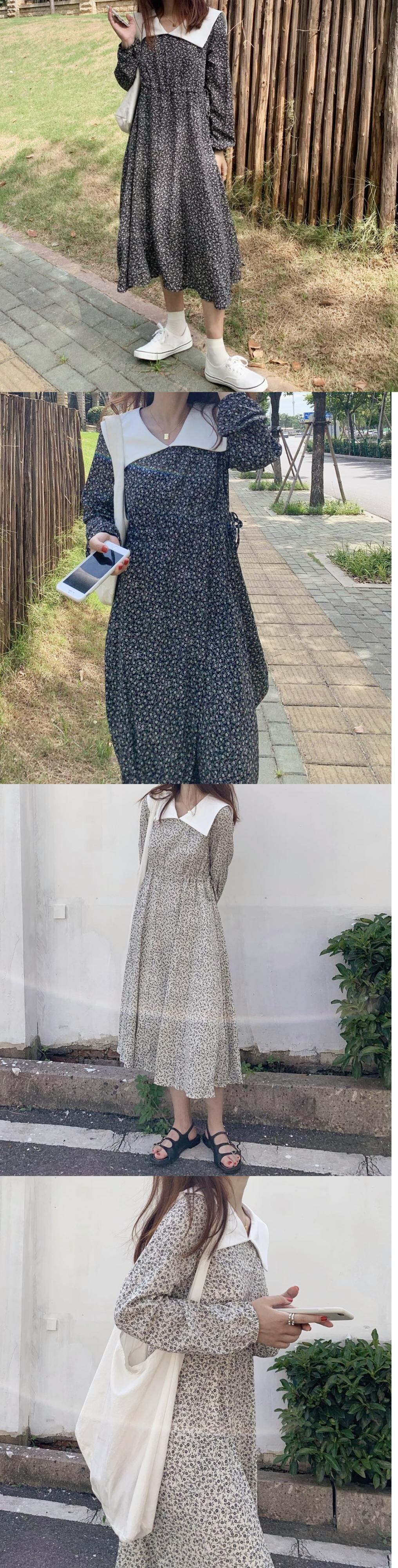 オータムカラーフローラルドレス カジュアルスリーブスカート ランタンスリーブ 秋物 花柄 ICC_レディース63679351871