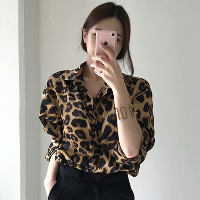 スタンダードレオパードプリント柄ルーズ長袖スリーブシャツ ロング レトロ ICC_レディース26101869792
