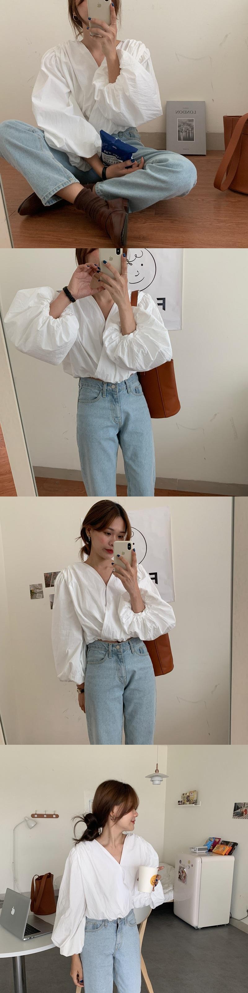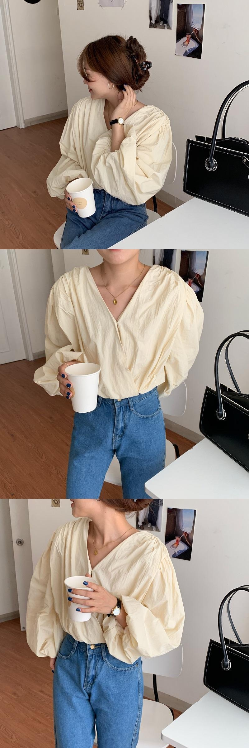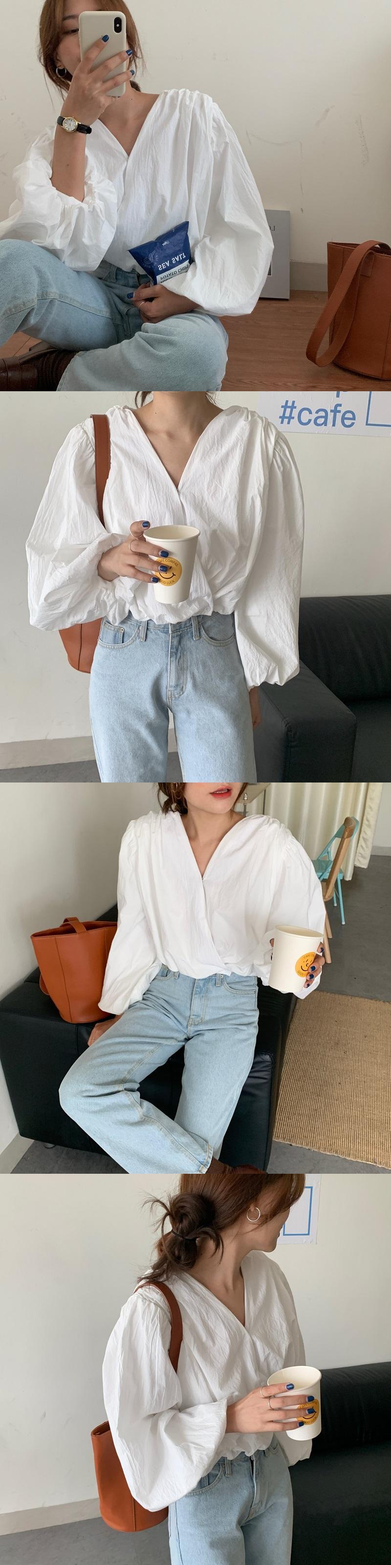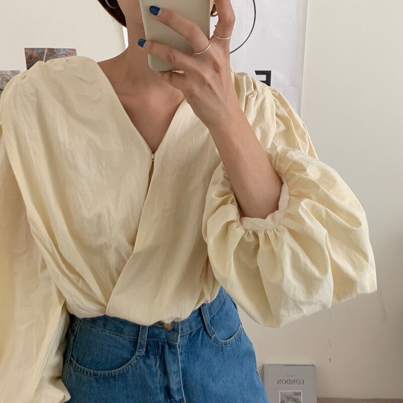 スタンダードスリーブVネックボタンルーズショートシャツ ランタンスリーブ レトロ ICC_レディース37448999379