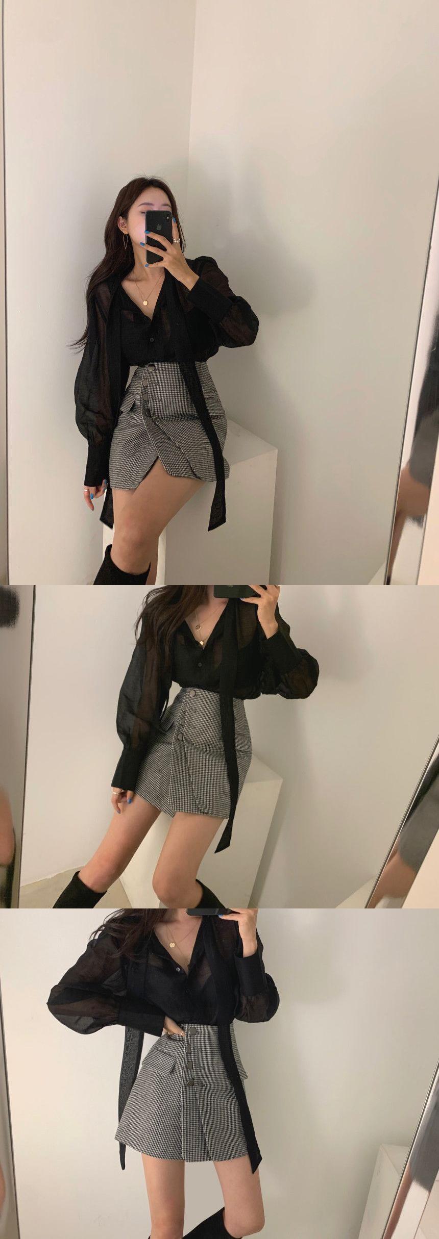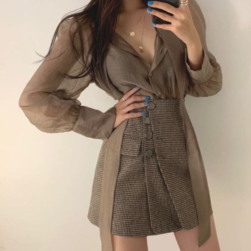 色:黒いシャツ,茶色のシャツ,黒と白のチェックスカート,茶色のスカート