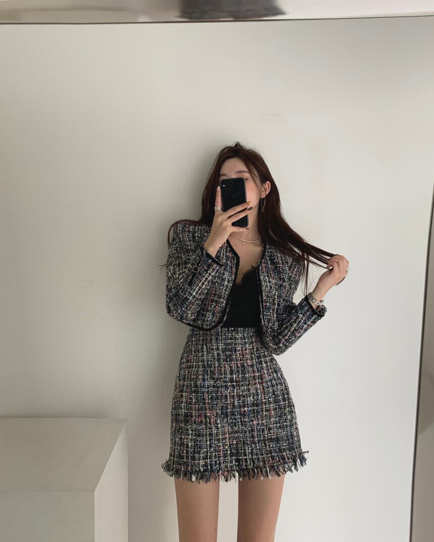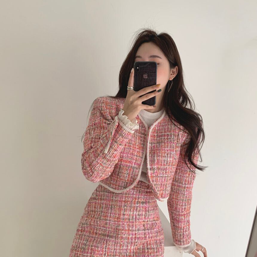 色:黒いジャケット,黒スカート,ピンクのジャケット,ピンクのスカート,アプリコットコート,アプリコットスカート