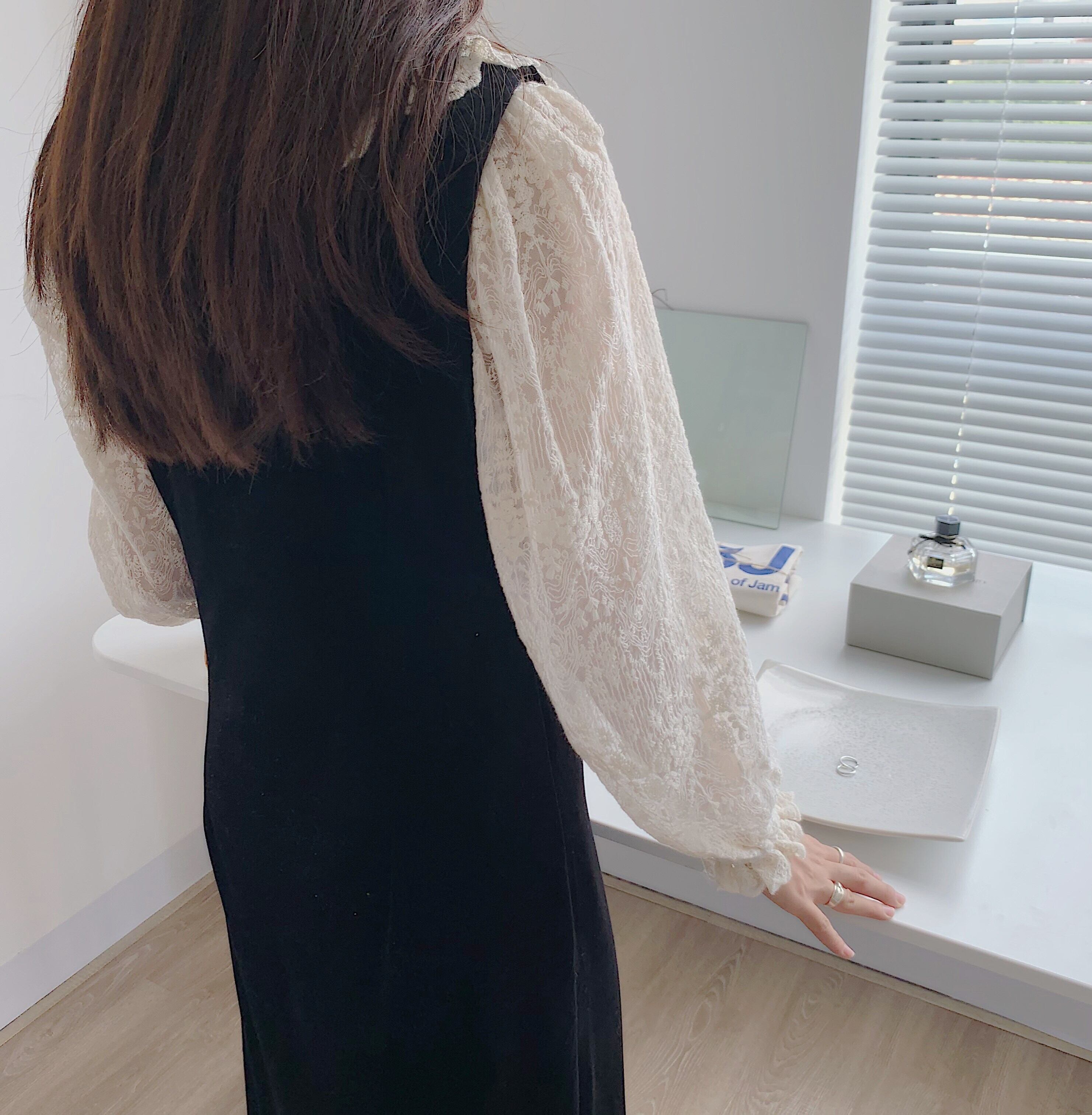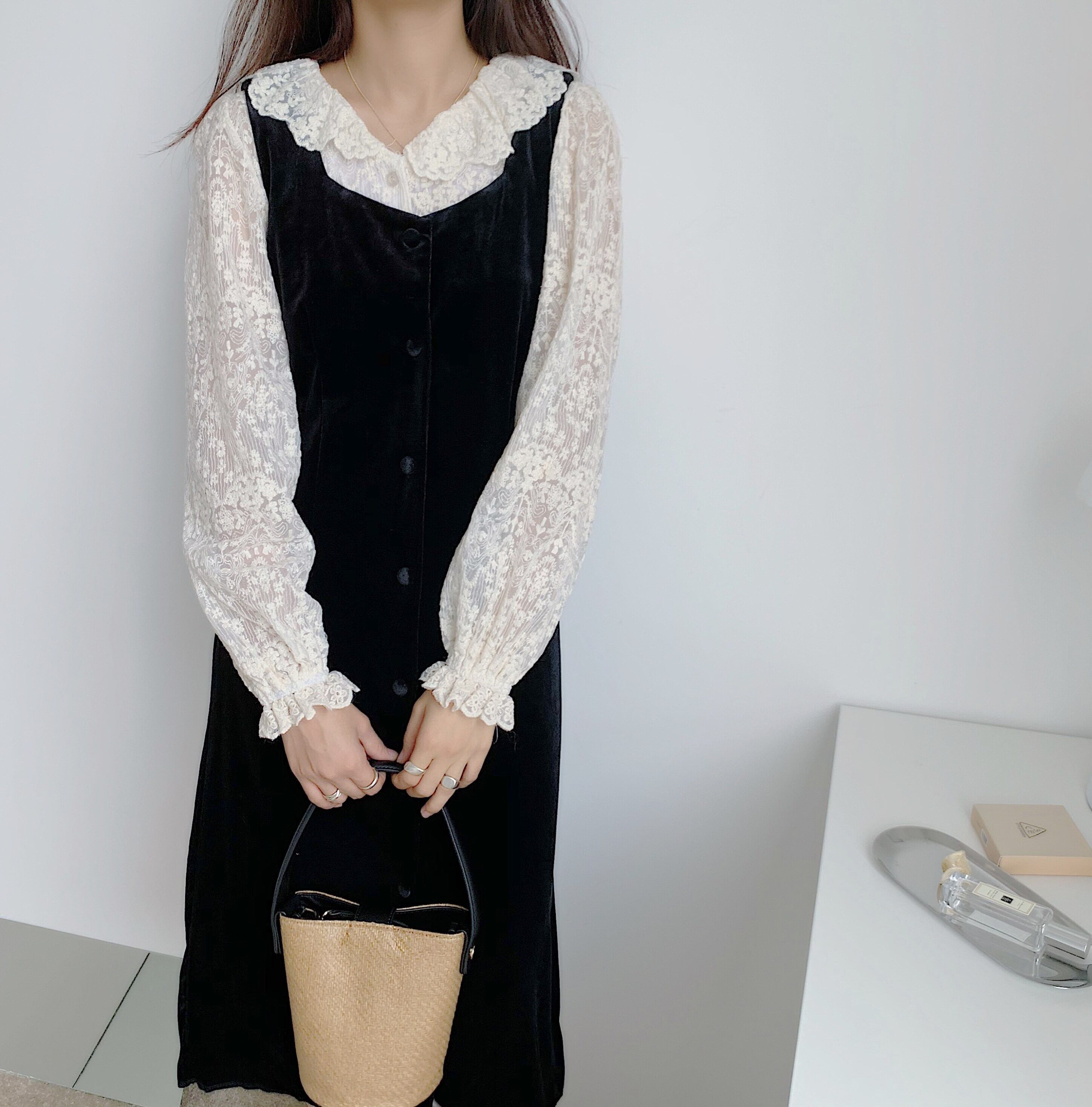 色:レーストップ,黒いドレス