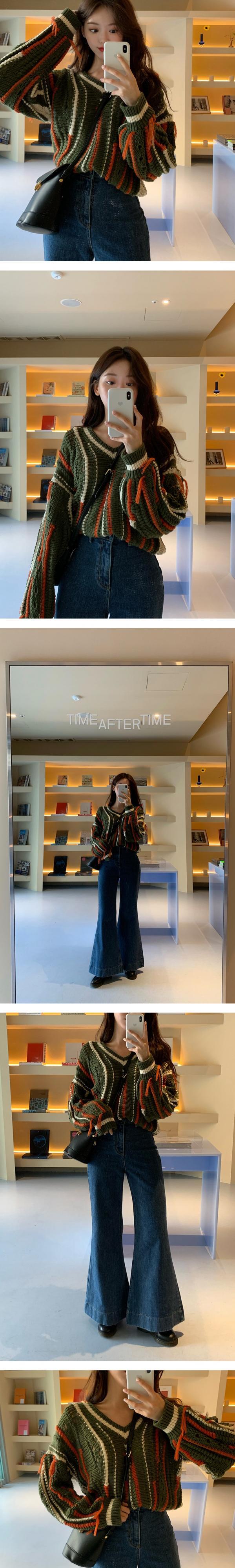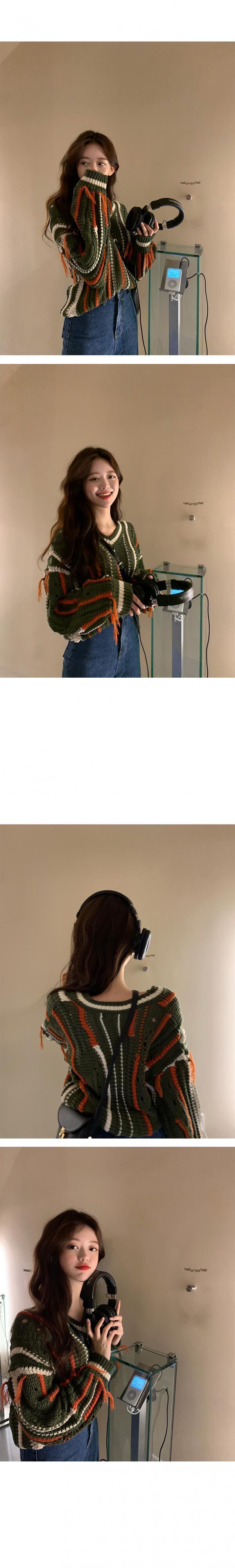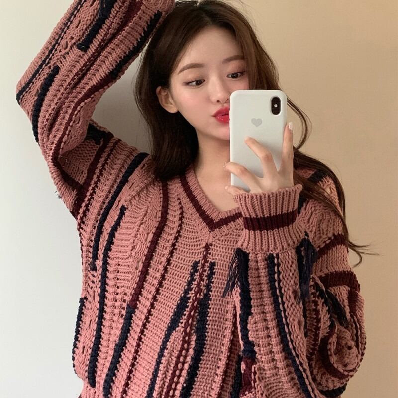 カラーストライプVネックセーター レディースオータムカジュアルルーズプルオーバー 長袖スリーブ ロング 秋物 ICC_レディース12325373638