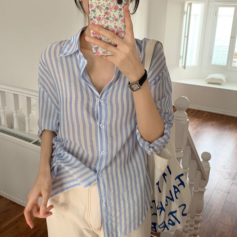 オータムスタイルスタンダードシャツ ルーズストライプ ロング レトロ 秋物 左左右右3748559973