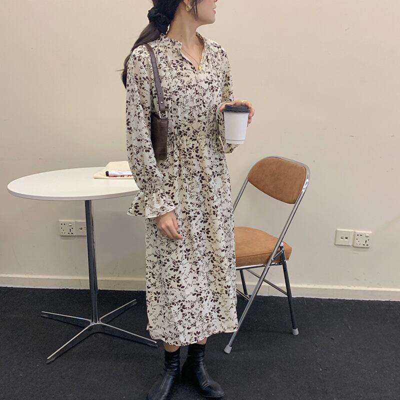 オータムスタンダードスカート スタイルロングルーズフローラルシフォンドレス レトロ 秋物 花柄 左左右右91170369964