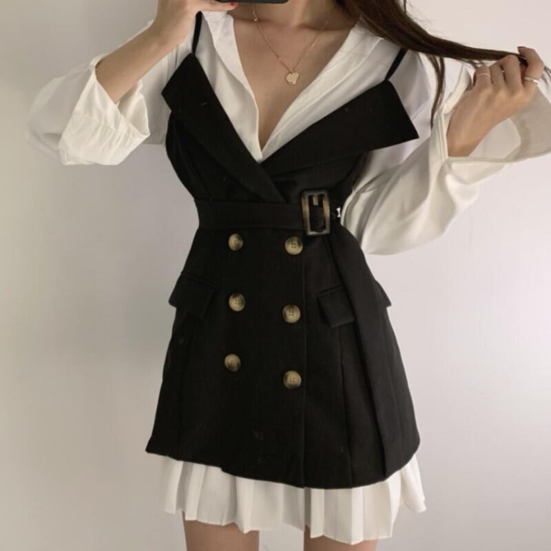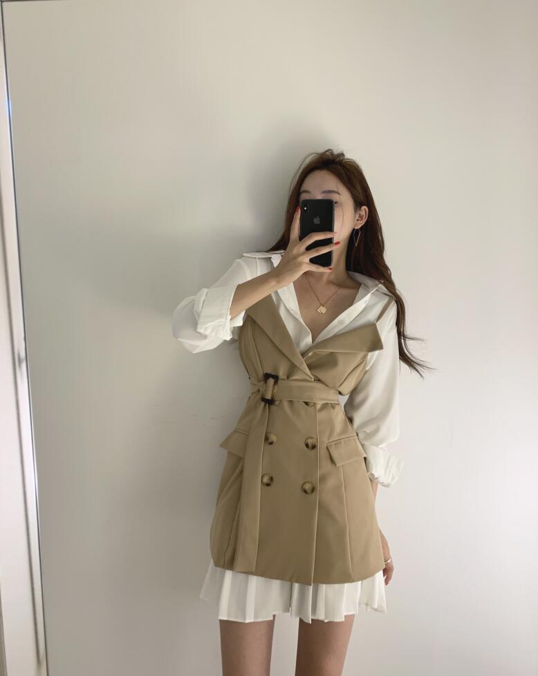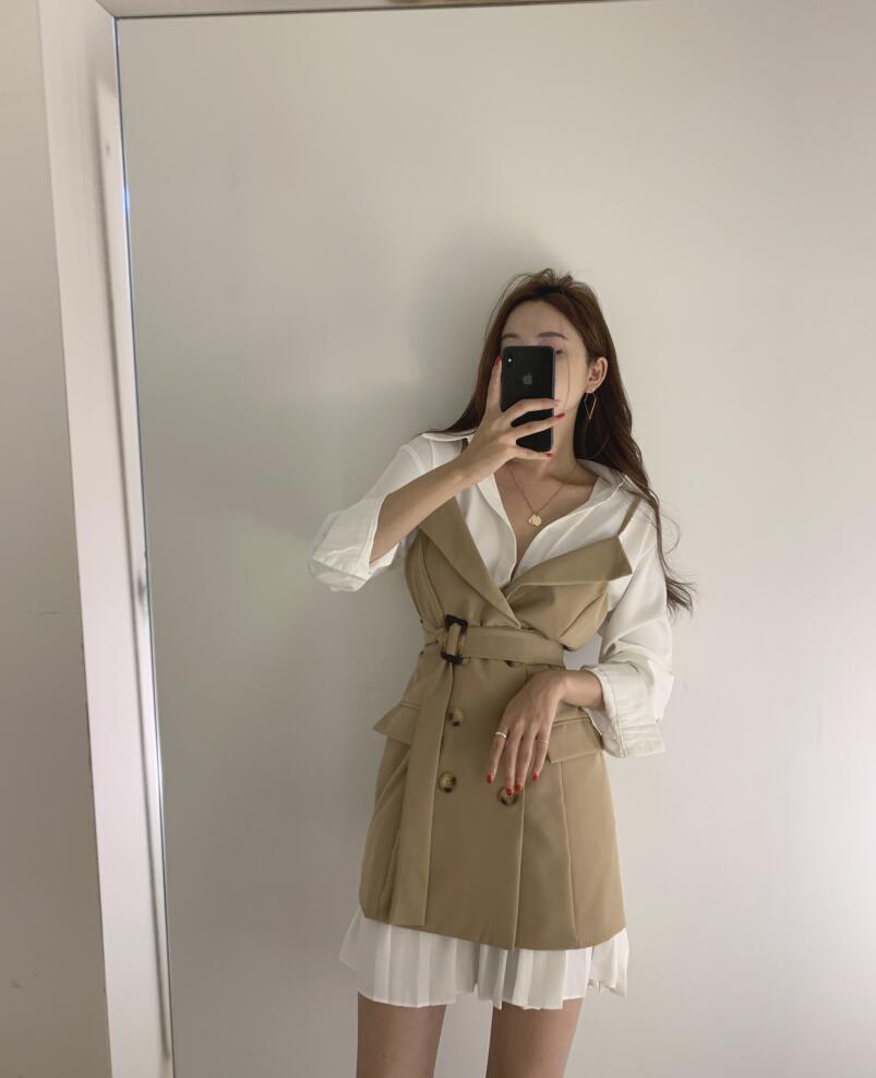 シャツ プリーツスカート スリムダブルブレストドレス レディース エレガント ICC_レディース19098290930