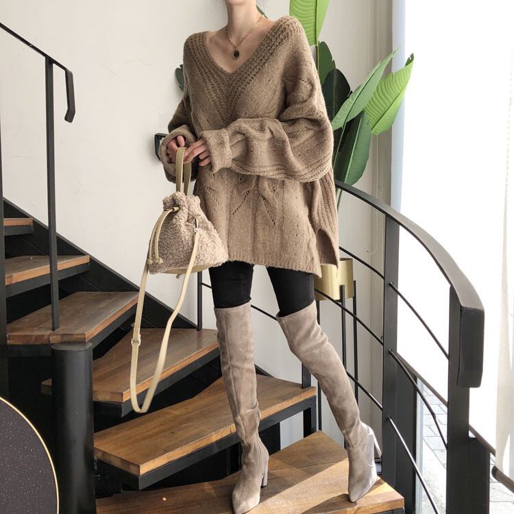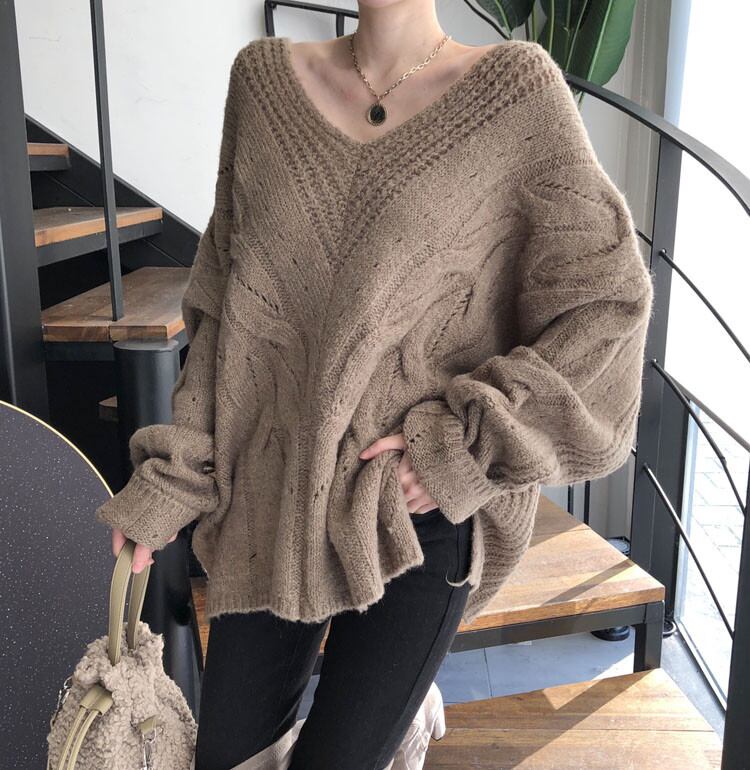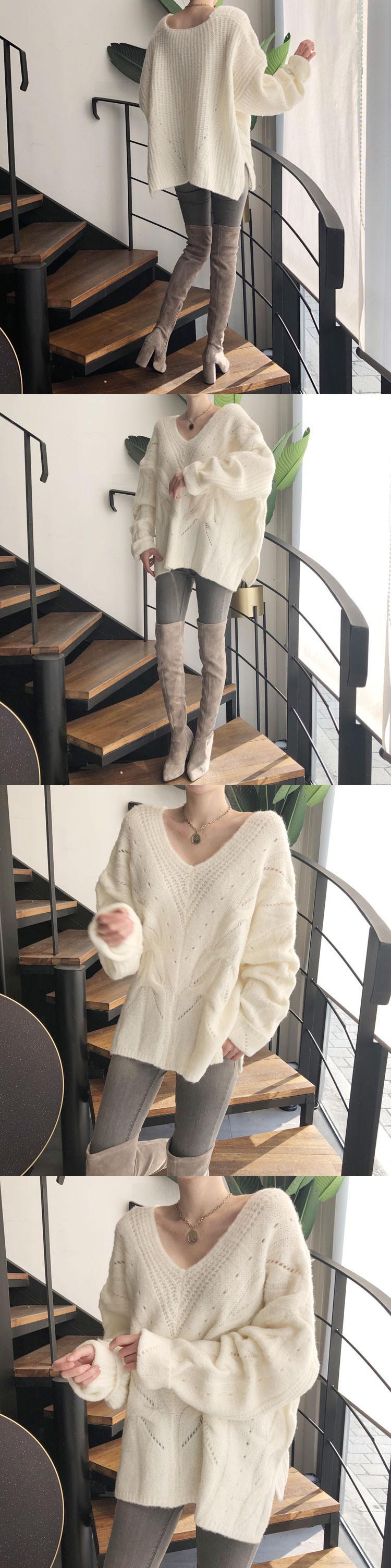 スタンダードVネックロングパターンスリットニットセーター レディース レトロ エレガント ICC_レディース69737984948