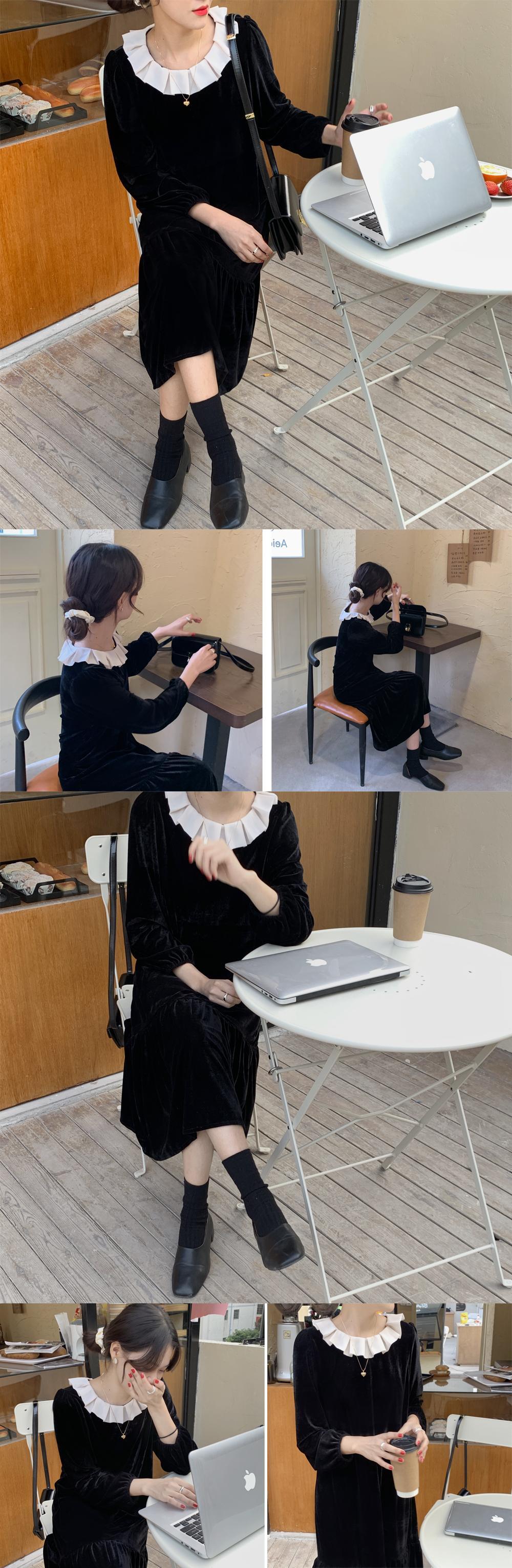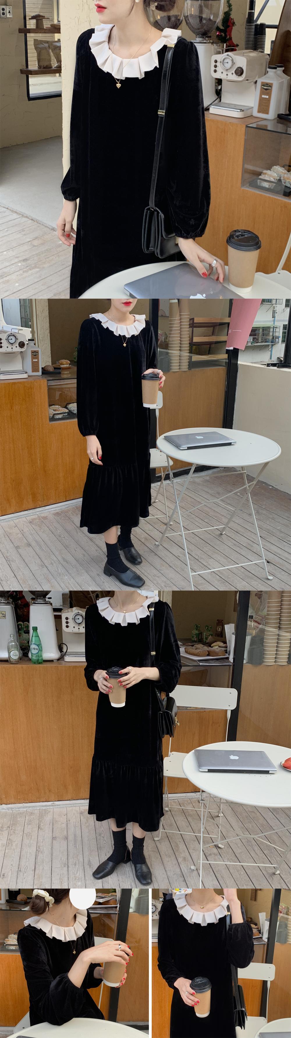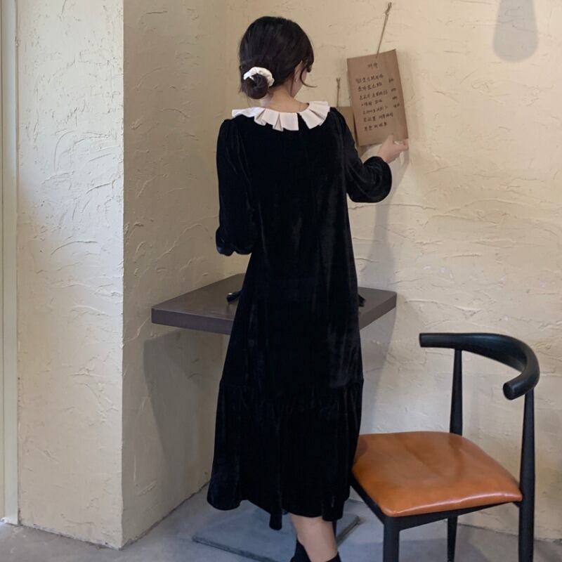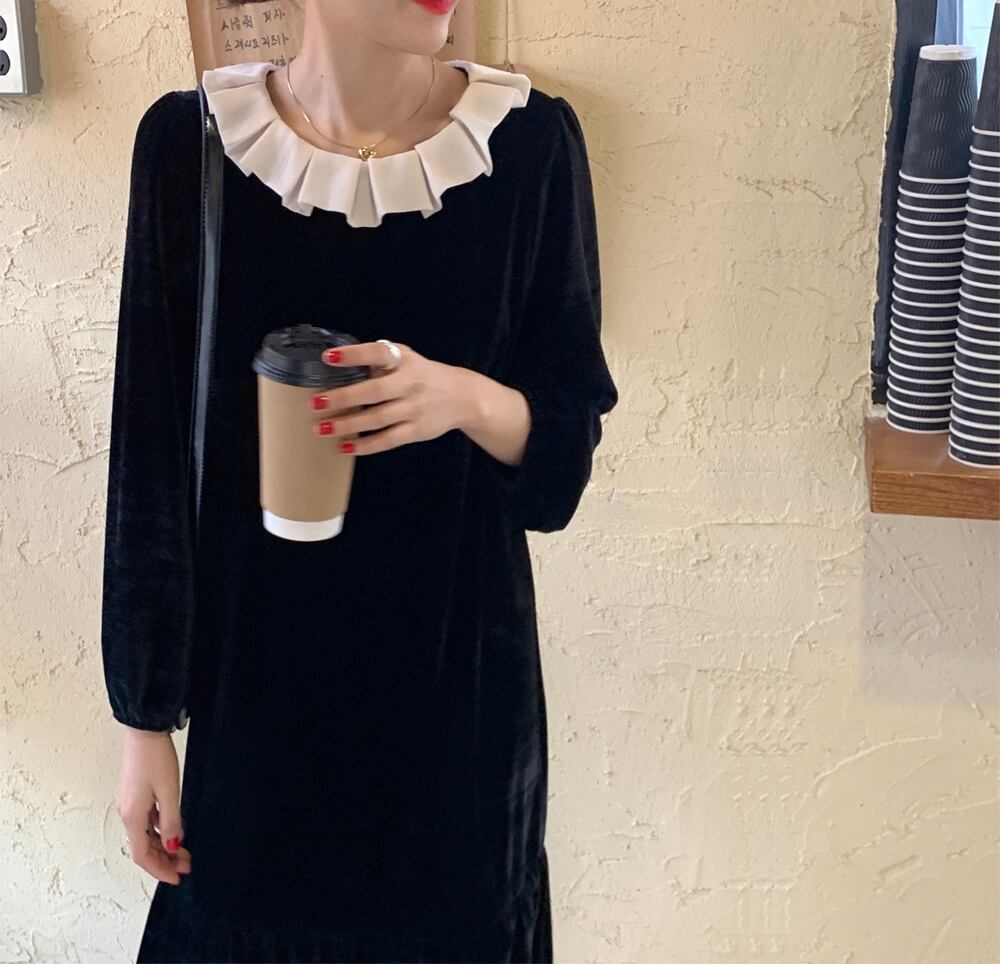 スタンダードプリーツラウンドネックルーズロングベルベットドレス ブラック レトロ Oネック ステッチ ICC_レディース39063475540