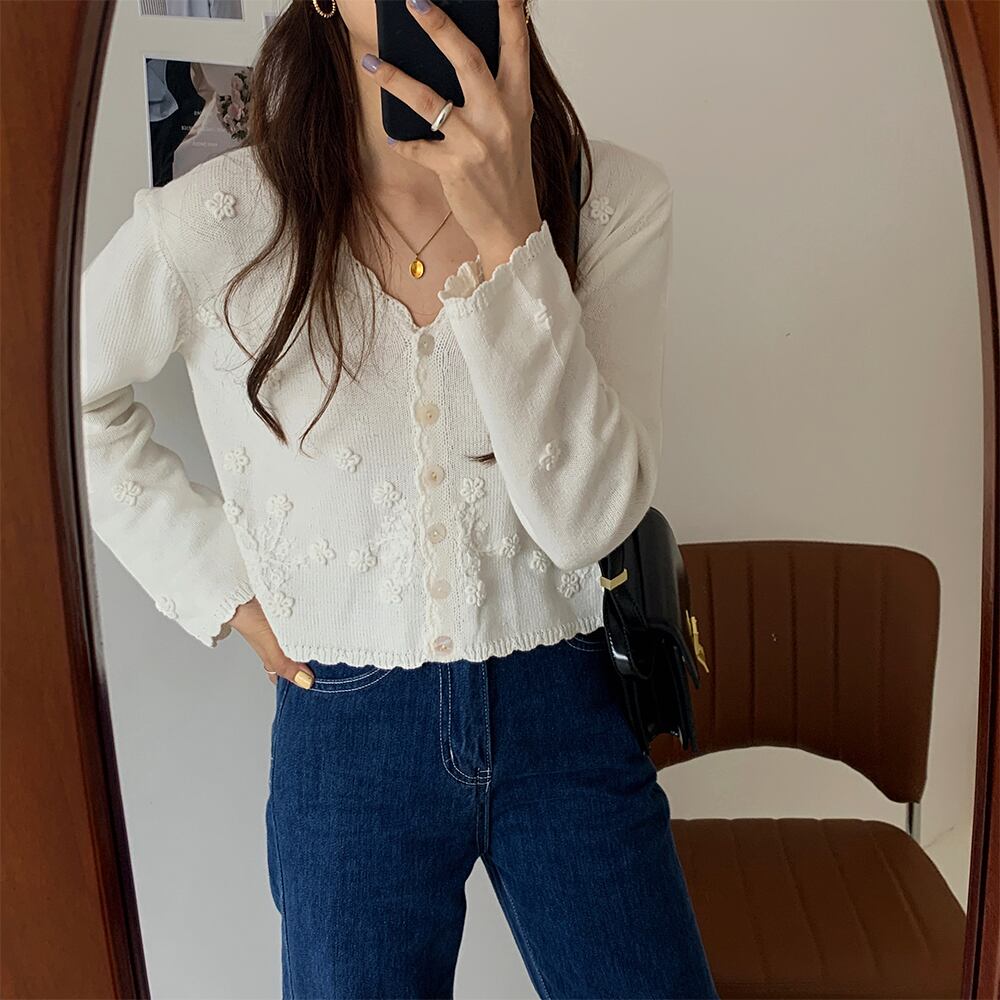 オータムスタイルスタンダードチェーン Flowerデザイン Vネックショートニットカーディガンセーター レディース レトロ 秋物 フラワーデザイン ICC_レディース39371003241