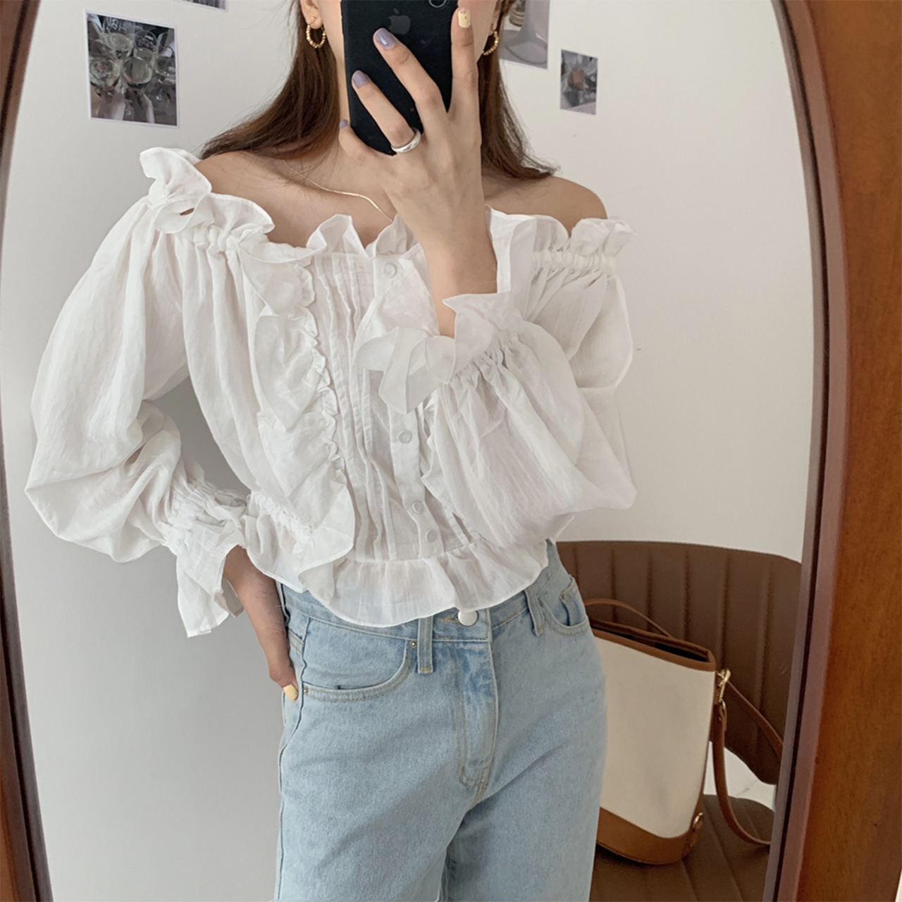 オータムプリーツカラースリーブホワイトシャツ 大人ガーリー スウィート キュート カジュアル 秋物 ICC_レディース74766615222