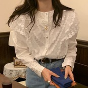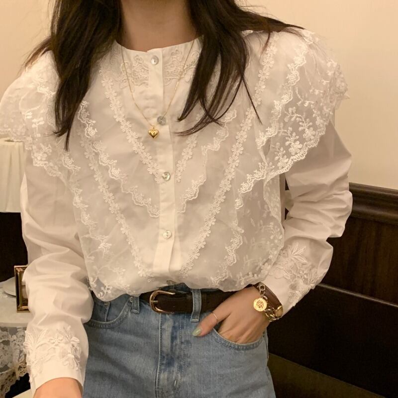 シャツ オータムラウンドネックレースホワイトトップス ロング 秋物 Oネック ICC_レディース41625652782