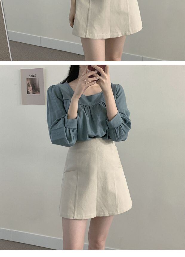 色:青いシャツ,アプリコットシャツ,コーヒースカート,アプリコットスカート