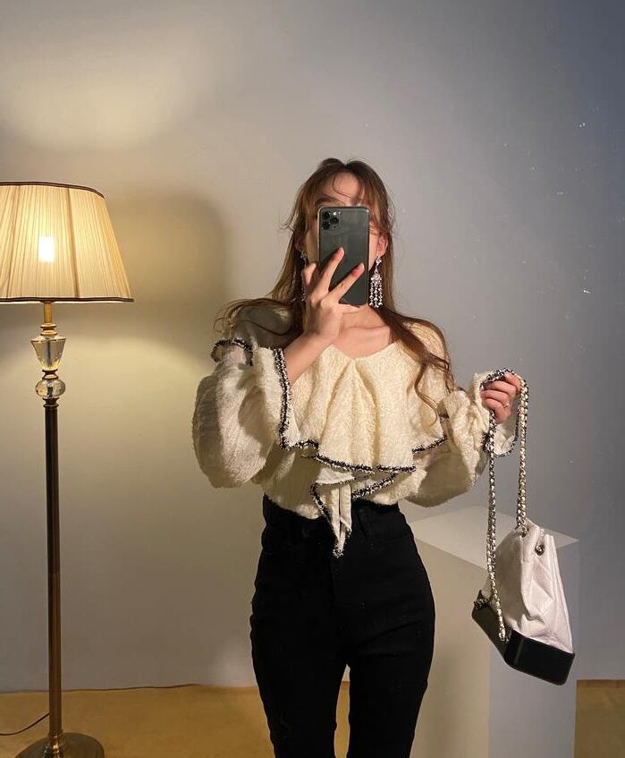 スタンダードオータムアシンメトリーレースカラースリーブシャツ レトロ 秋物 ICC_レディース96509854711
