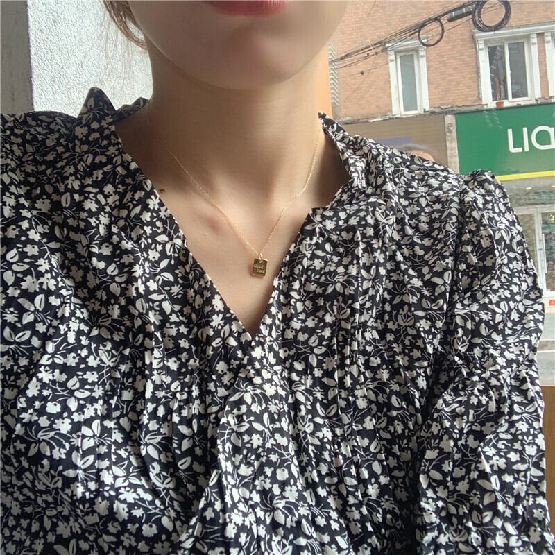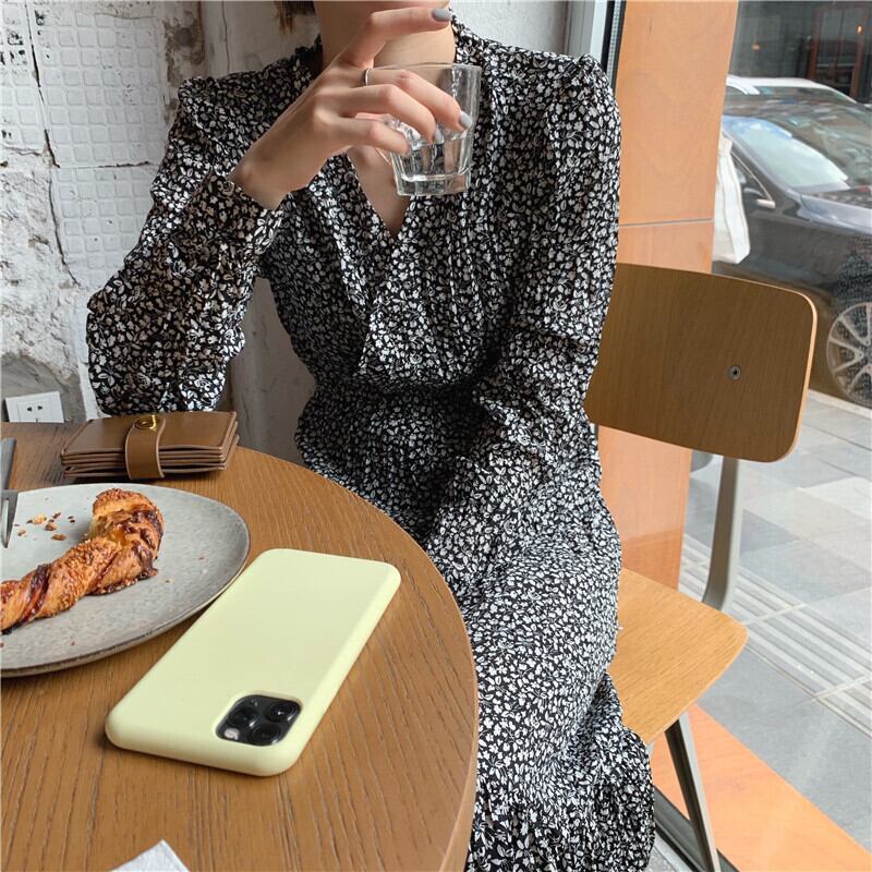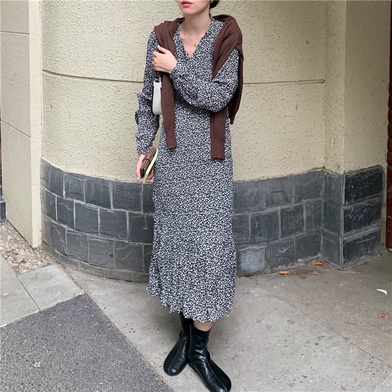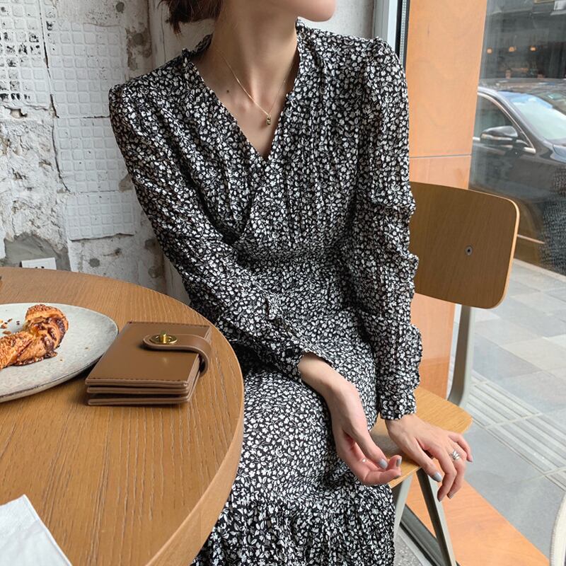 オータムスカート ロングスタンダードVネックフローラルシフォンドレス レトロ 秋物 花柄 フラワーデザイン 左左右右3781060931
