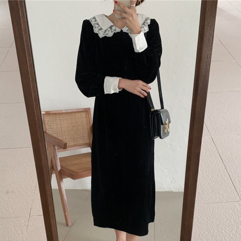 ベルベットオータムカラーレース薄手ドレス 秋物 ステッチ ICC_レディース52378884779