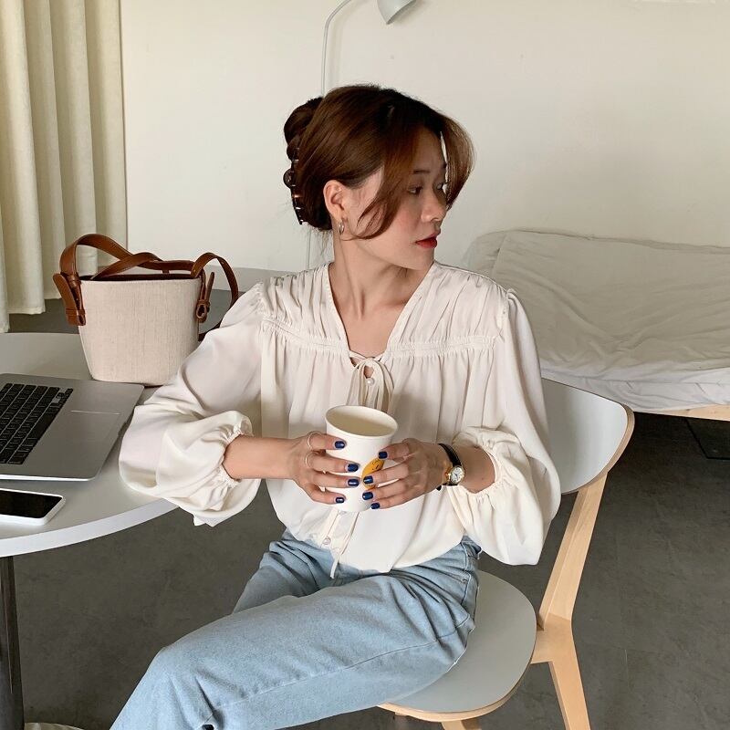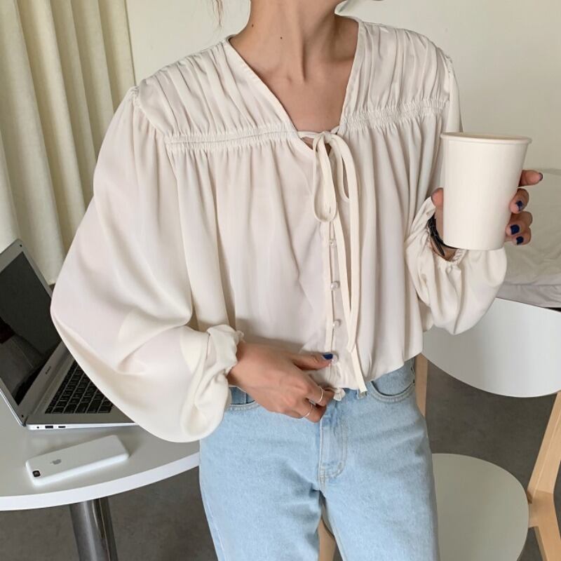 スタンダードVネックプリーツシャツ 薄手オータム ロング ランタンスリーブ レトロ レース 秋物 レースアップ ICC_レディース45945461200