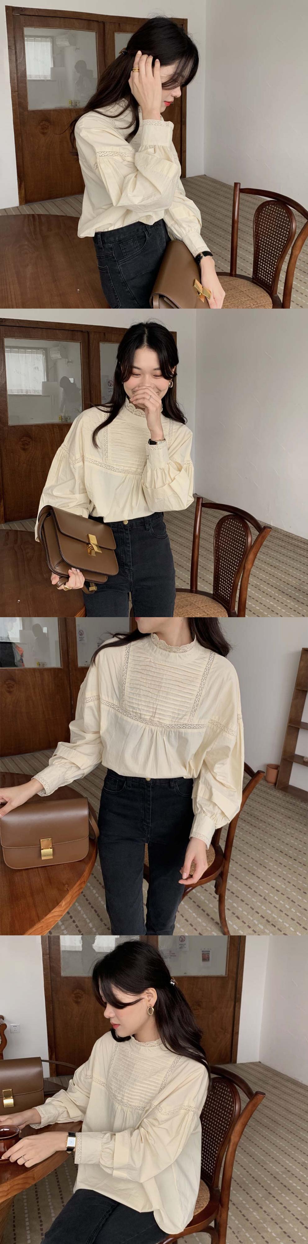 スタンダードレースサイドスタンドカラーカラープリーツFlowerデザイン ルーズスリーブシャツ トップス ランタンスリーブ レトロ フラワーデザイン ステッチ ICC_レディース22821121332