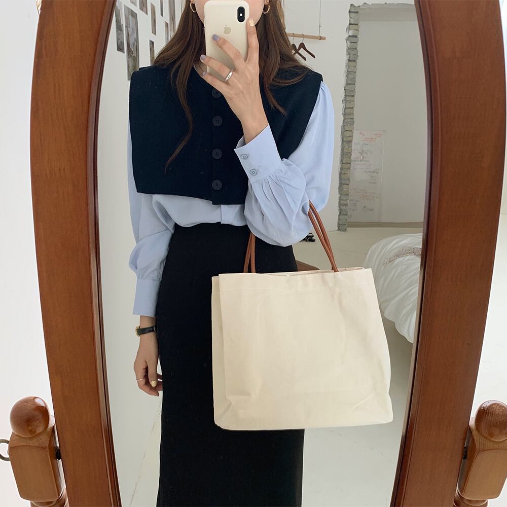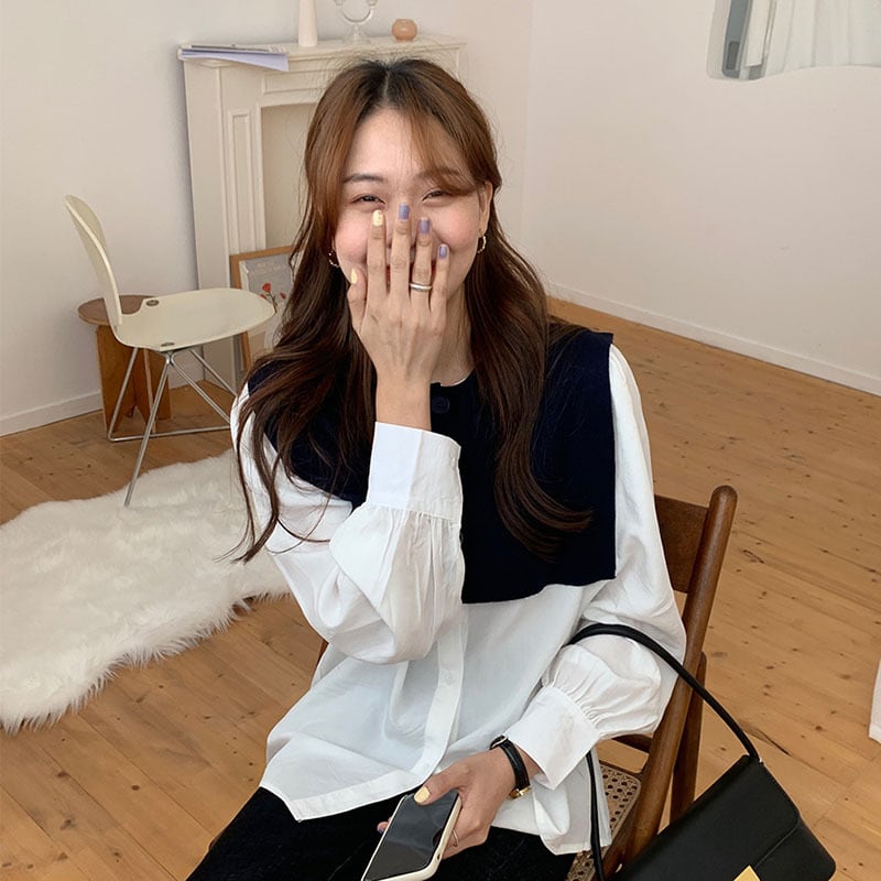 オータムスタンダードラウンドネックショートニットホワイトブルーシャツ ロング レトロ 秋物 Oネック ICC_レディース96521391654