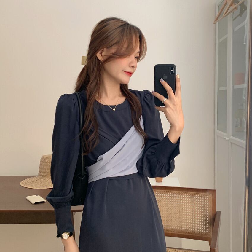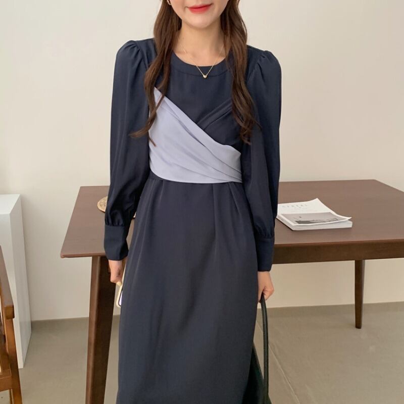 ラウンドネックカラークロスストラップ ウェストロングスリーブドレス レディース Oネック ICC_レディース86917483462