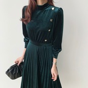 スタンダードスタイルベルベットプリーツドレス スカート レトロ レース ICC_レディース312882654