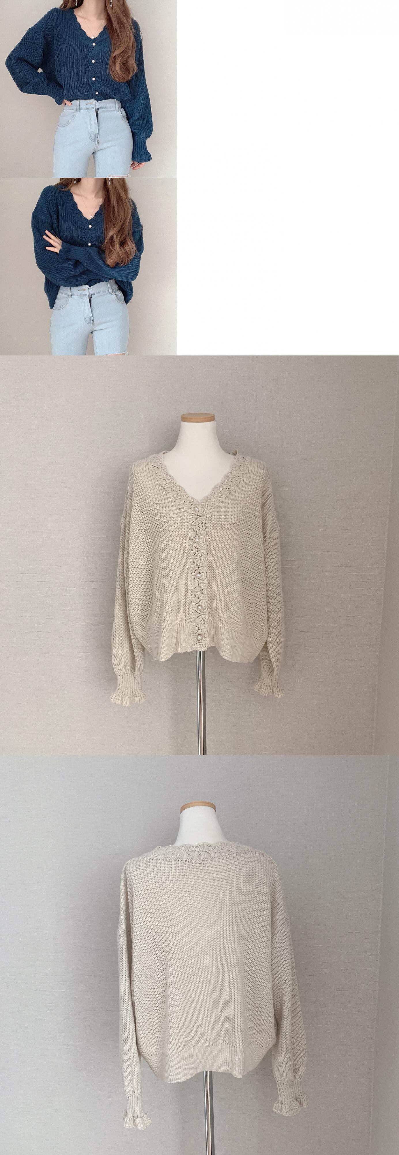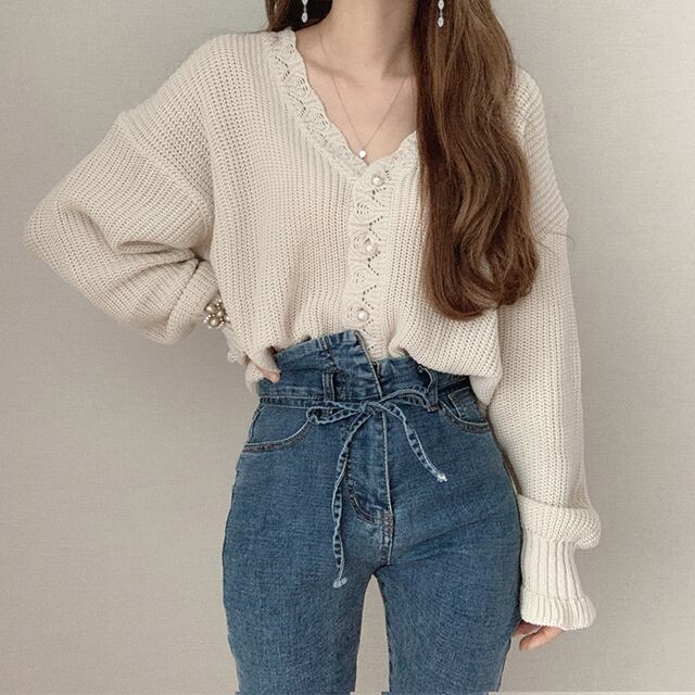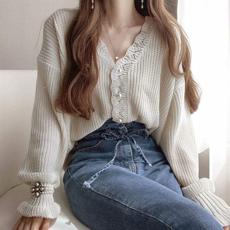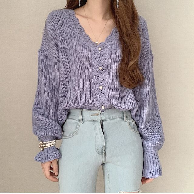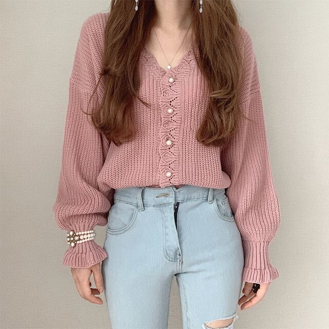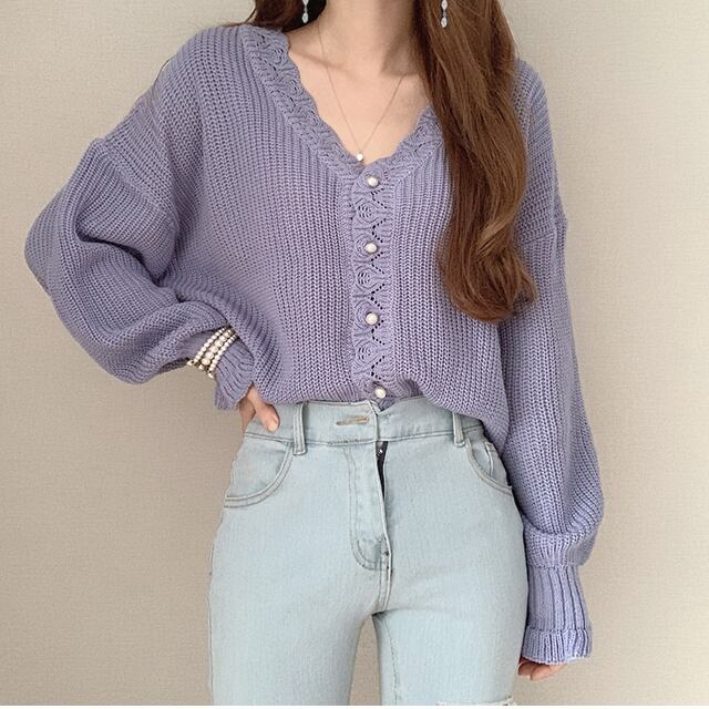 オータムスタンダードパターンVネックルーズスリーブニットカーディガンセーター レディース レトロ 秋物 パール 真珠 ICC_レディース84626382046