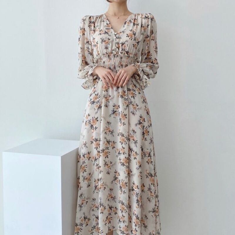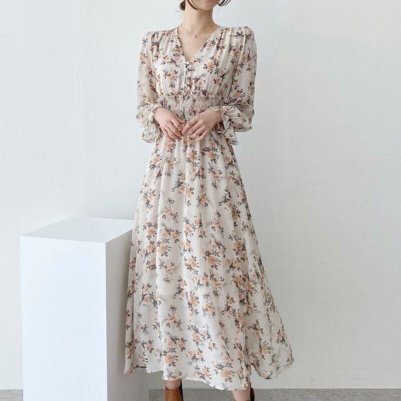オータム薄手Vネックハイウェストウェストスリーブフローラルドレス ロングスカート レッド 秋物 花柄 ステッチ ICC_レディース95820681542