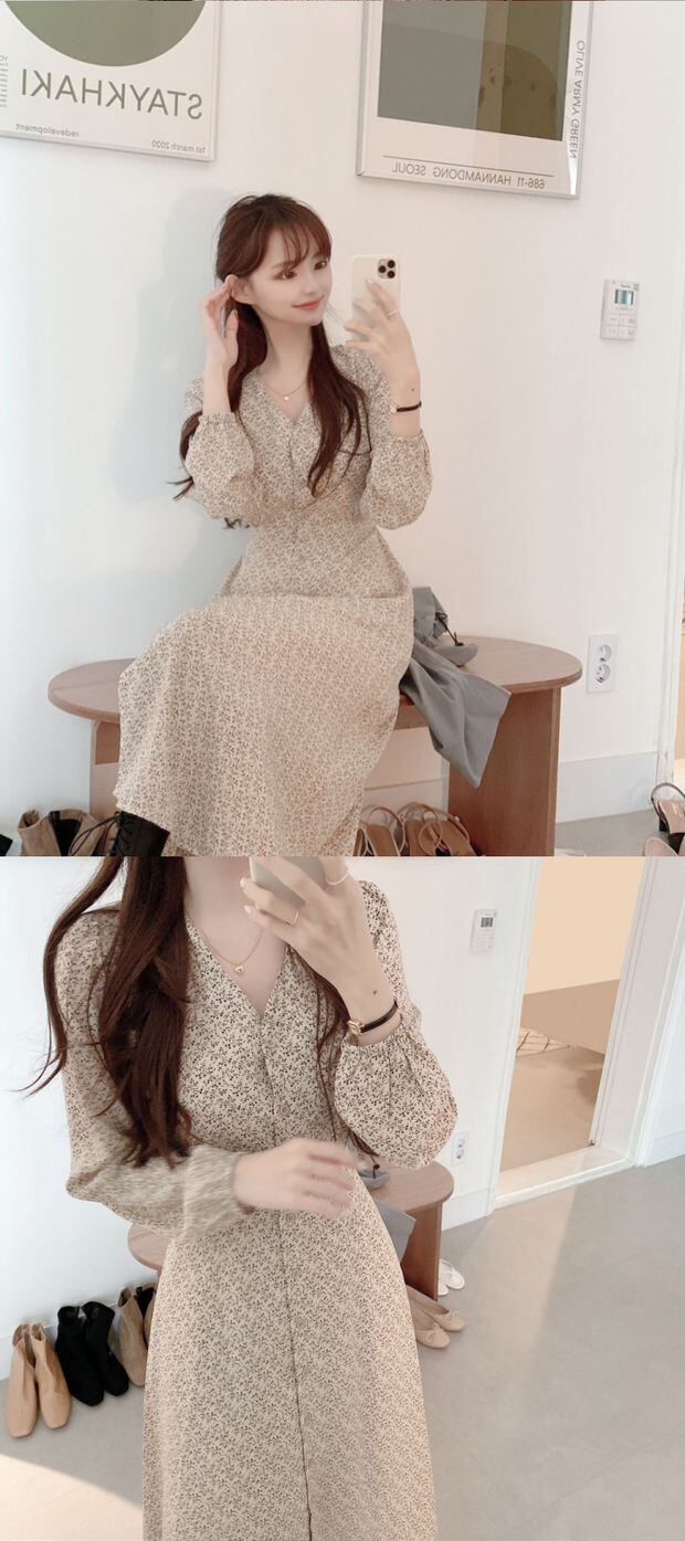 オータムスタイルロングフローラルドレス スカート Vネックシフォン 秋物 花柄 左左右右10968639661
