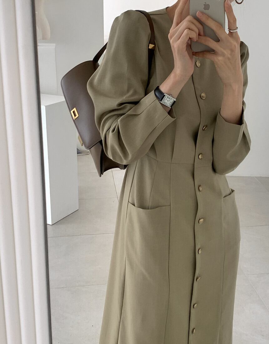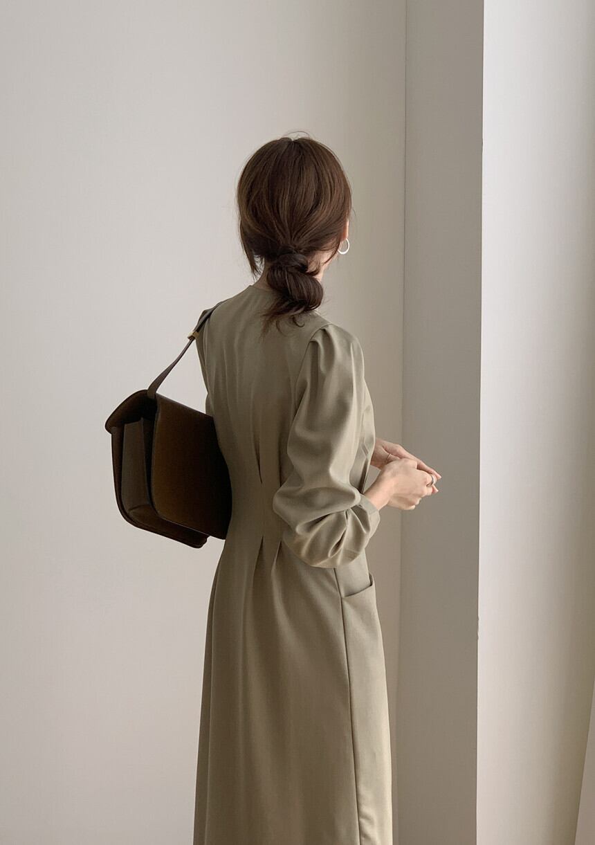 ミニマリストラウンドネックプリーツウェストポケットドレス Oネック ICC_レディース91402023337