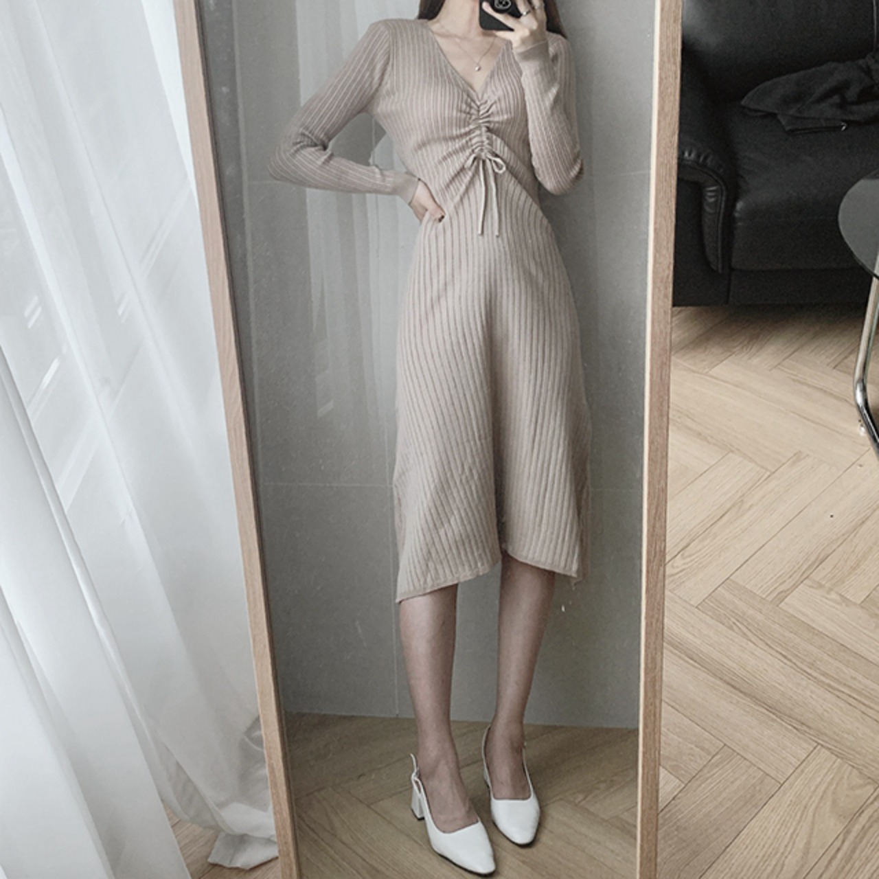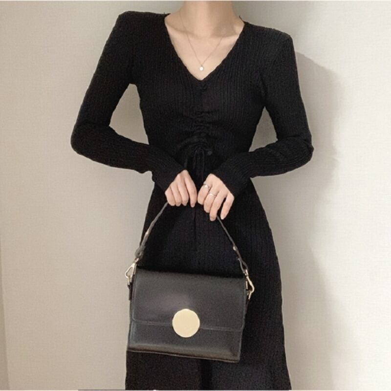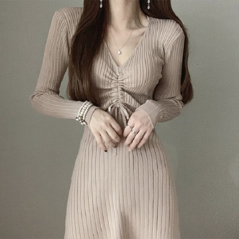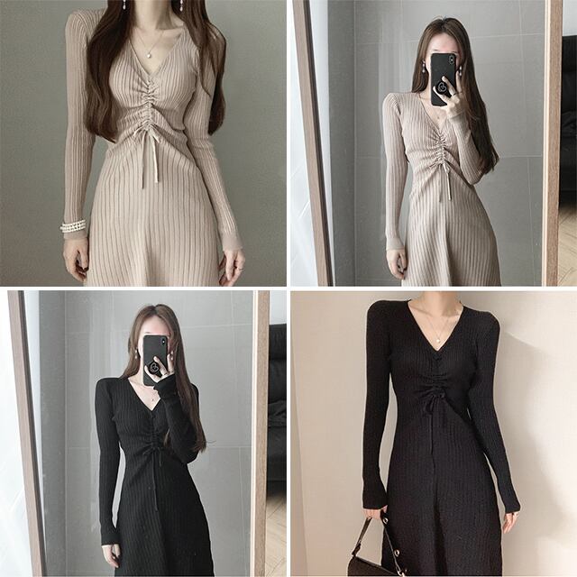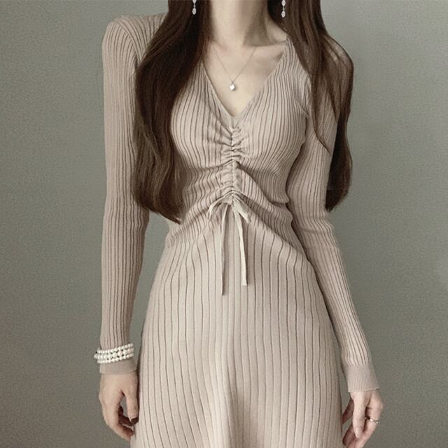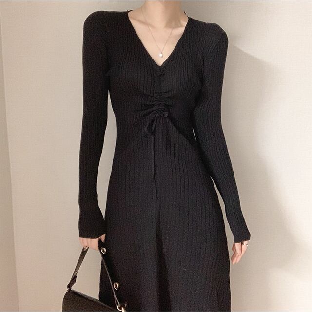 Vネックギャザープリーツウェストスリムニットドレス レディース ロング エレガント ICC_レディース31513868179