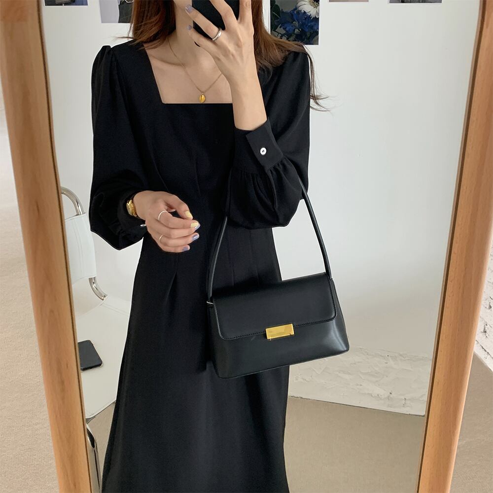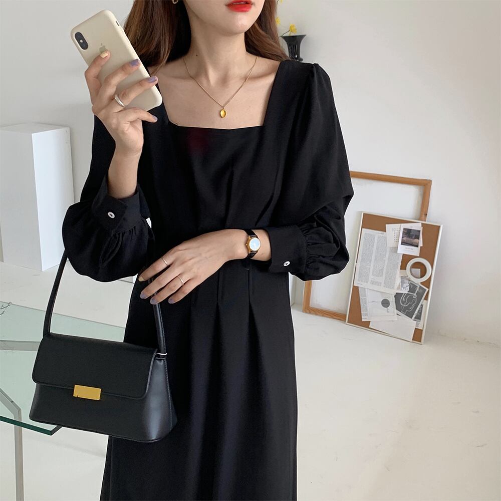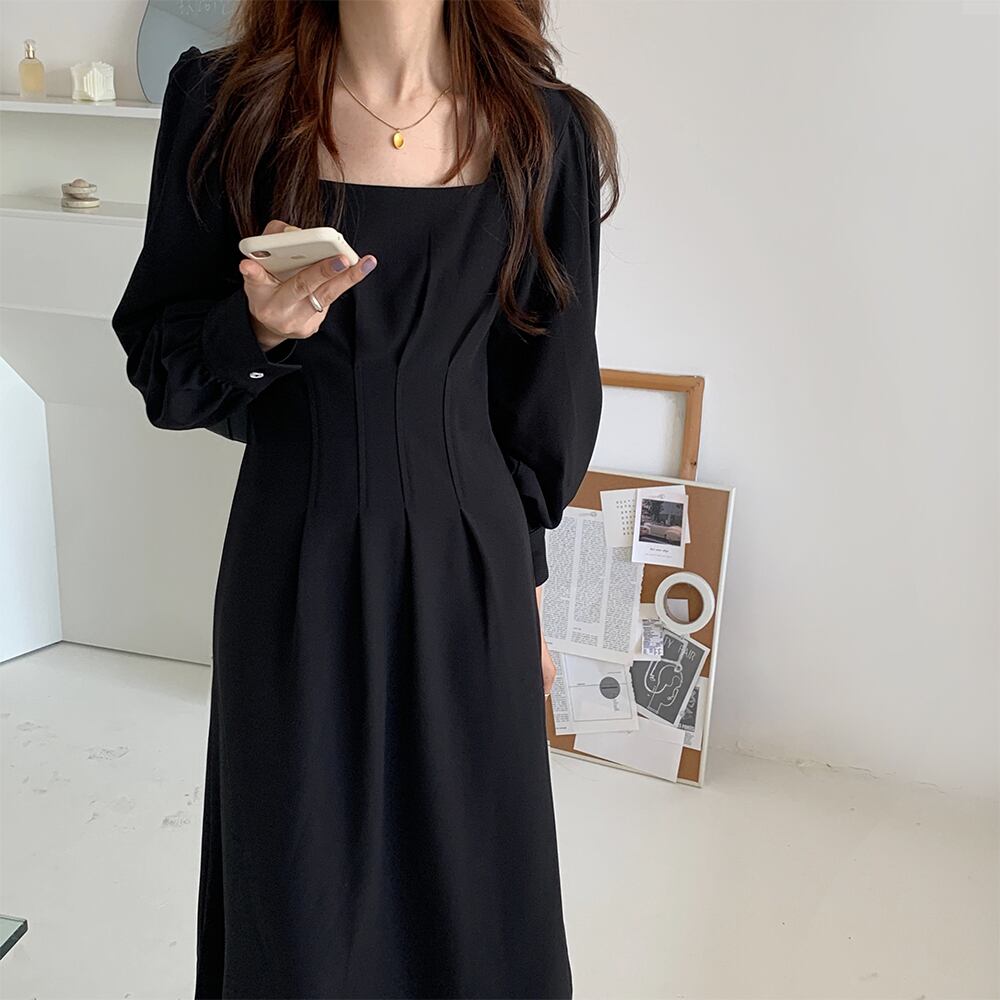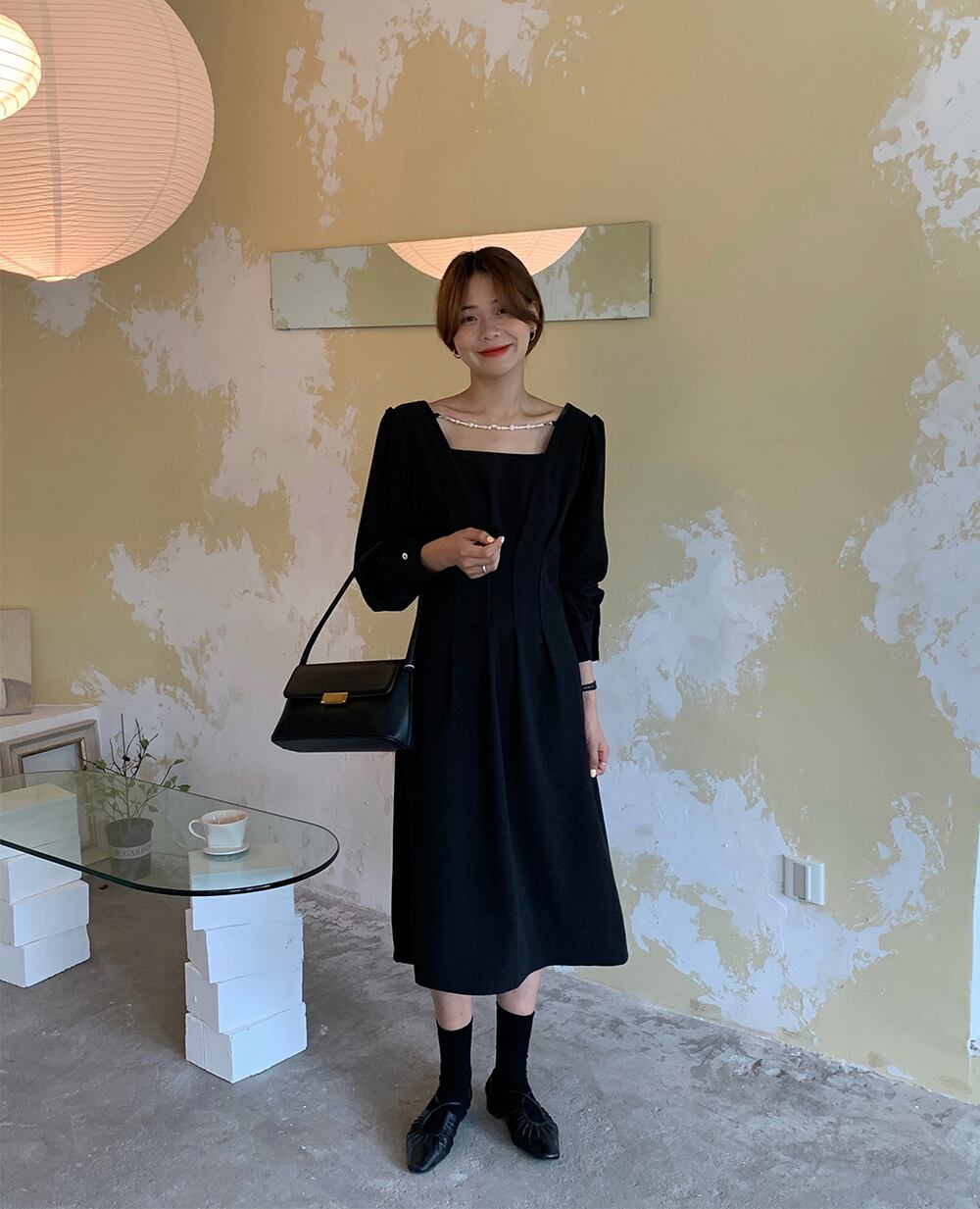 ミニマリストカラーハイウェストウェストプリーツスリーブドレス ブラック スクウェア ICC_レディース64087435536