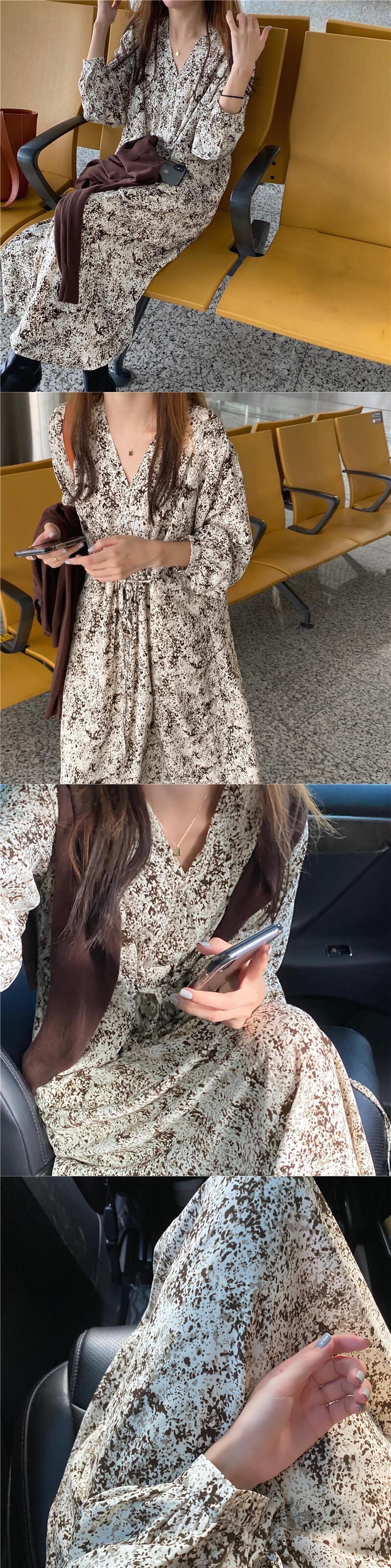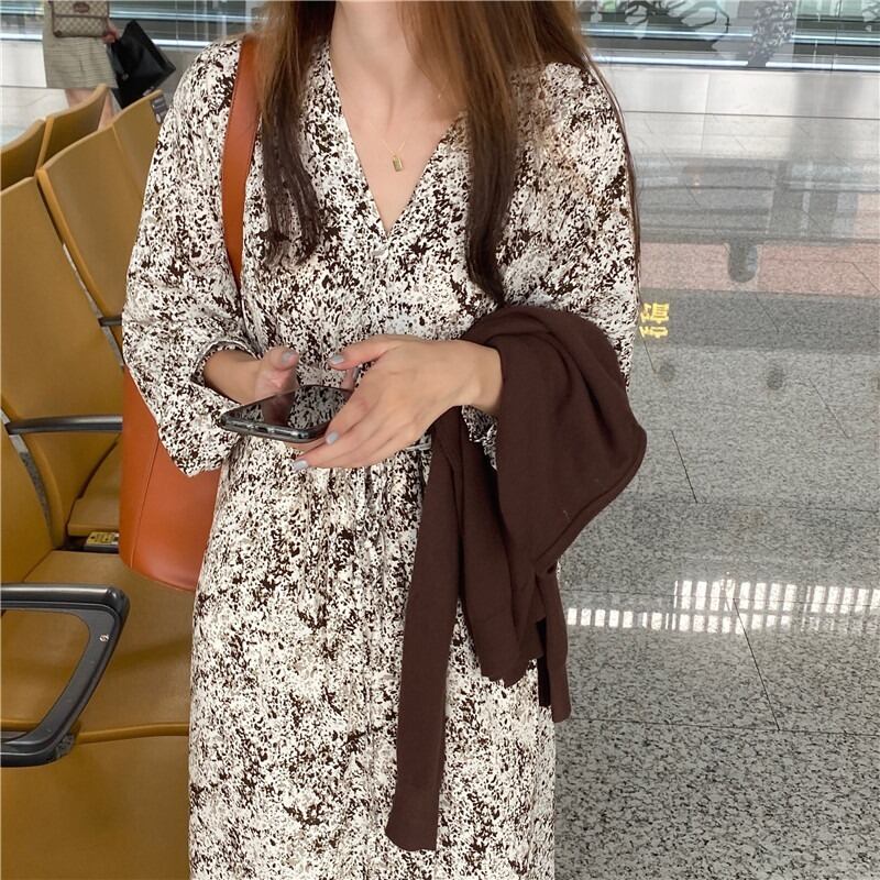 スカート オータムVネックドレス ウェスト薄手スタンダードフローラルロング レトロ 秋物 花柄 ICC_レディース33674217600