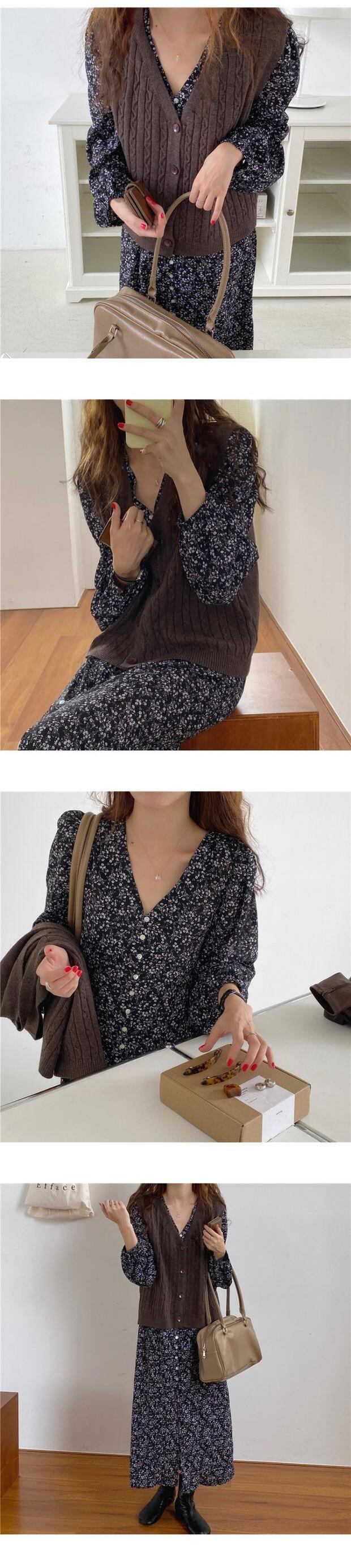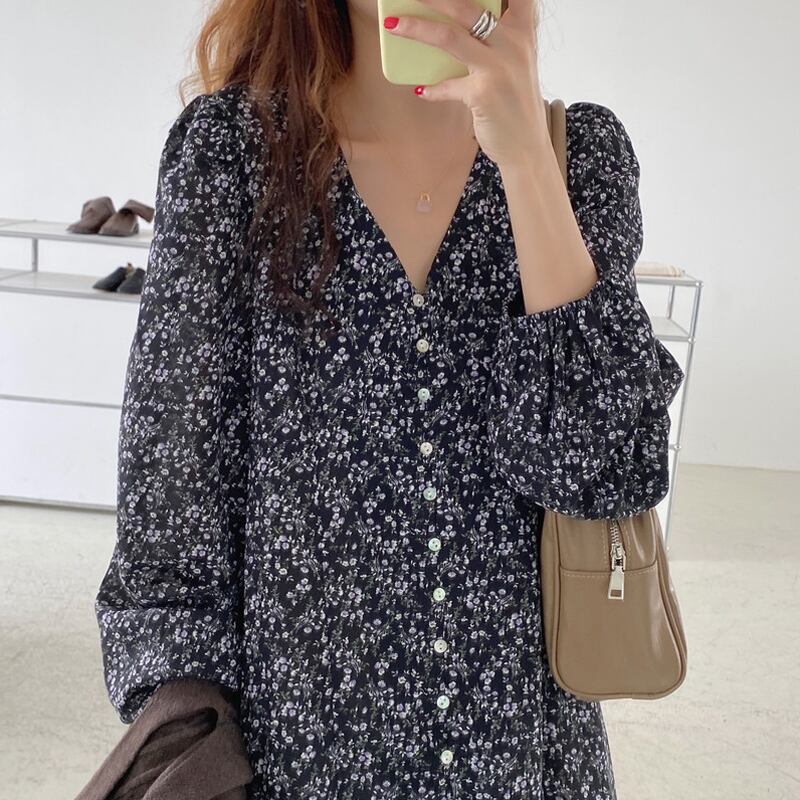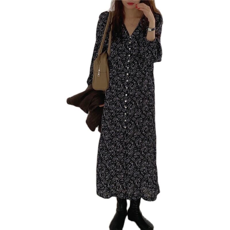 オータムロングスカート ルーズアンクルスタンダードフローラルシフォンVネックドレス レトロ 秋物 花柄 フラワーデザイン 左左右右1373829669