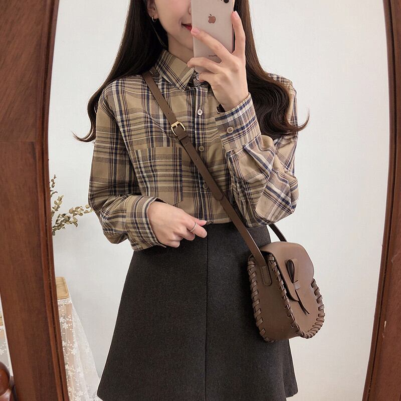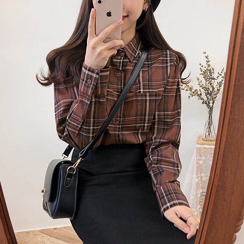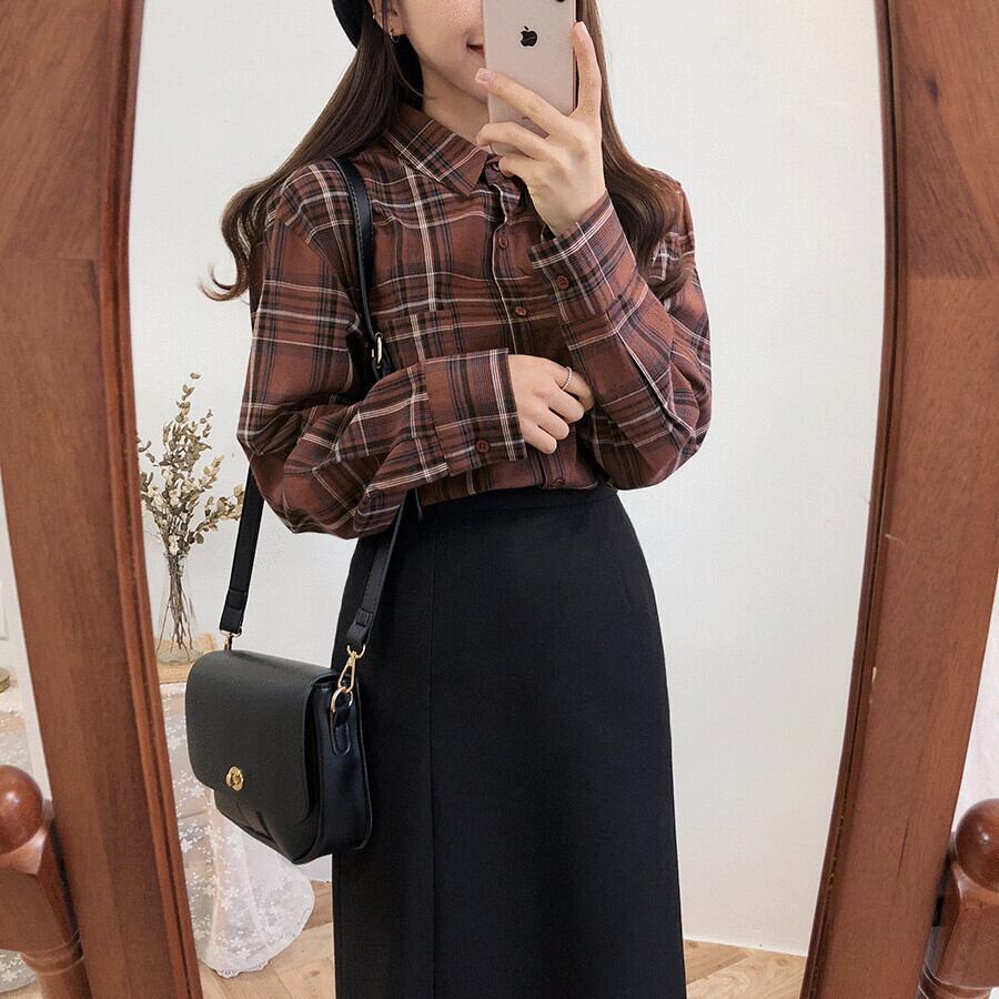スタンダードスタイルカラーシャツ スプリングオータム格子柄レッドトップス レトロ 春物 秋物 左左右右1258811