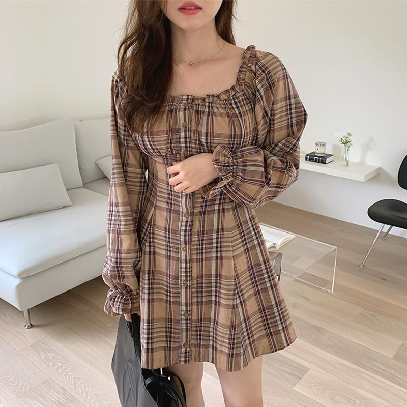 スプリングオータムスカート ウェスト格子柄ドレス 大人ガーリー スウィート キュート カジュアル 春物 秋物 フラワーデザイン 左左右右1727084913