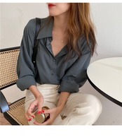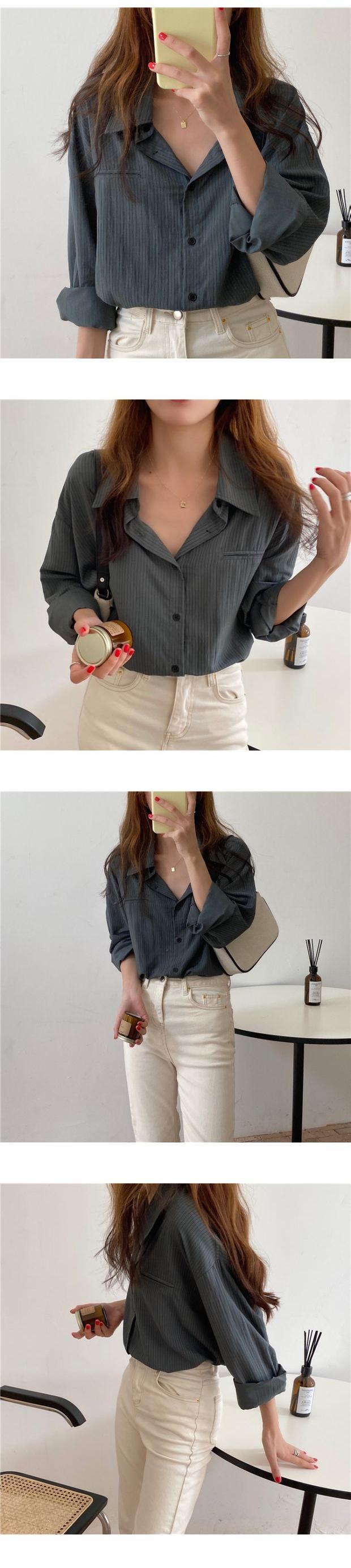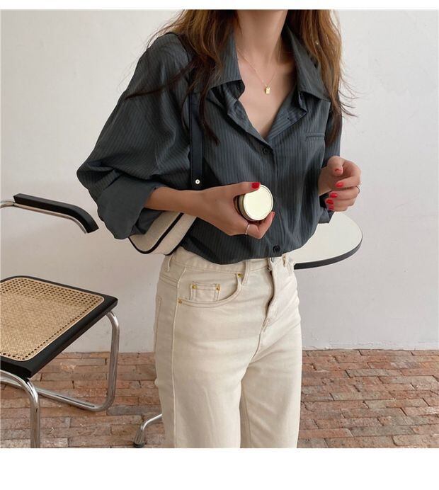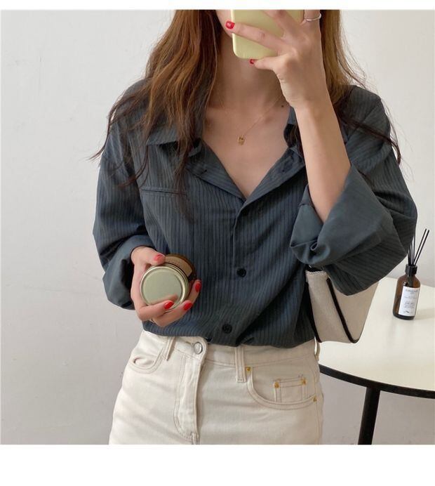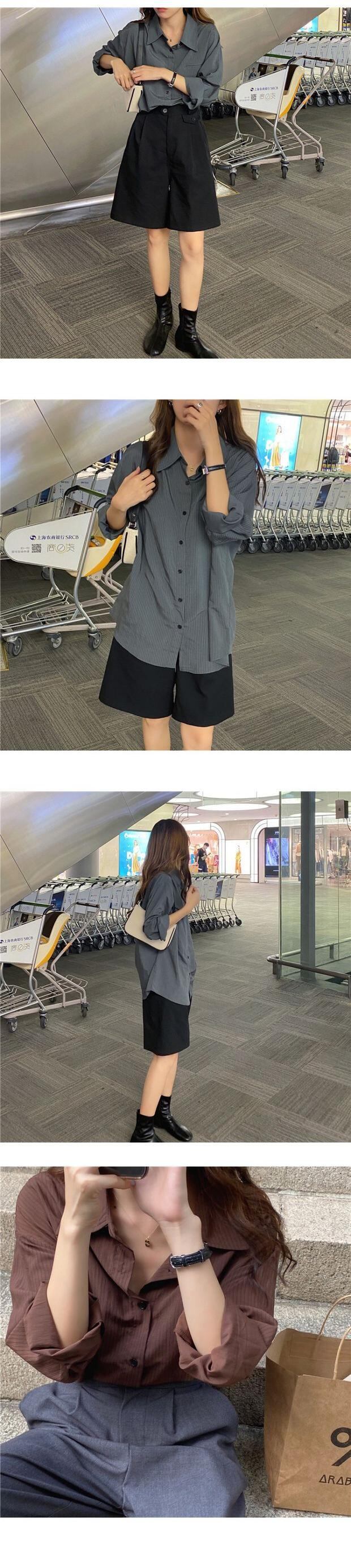 スプリングオータムスタンダードシャツ カジュアルカラールーズストライプ ロング レトロ 春物 秋物 左左右右38770212361