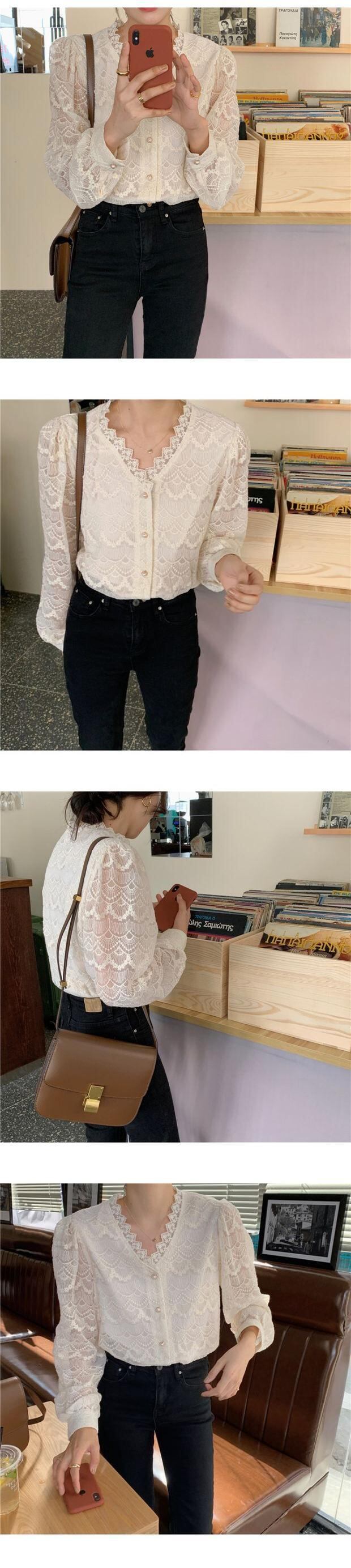 オータムシャツ Vネックレース ロング レッド 刺繍 大人ガーリー スウィート キュート カジュアル 秋物 左左右右60315879651