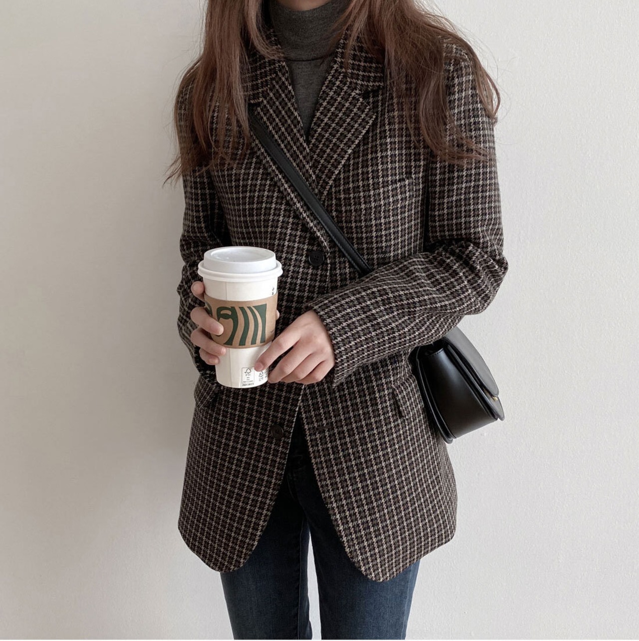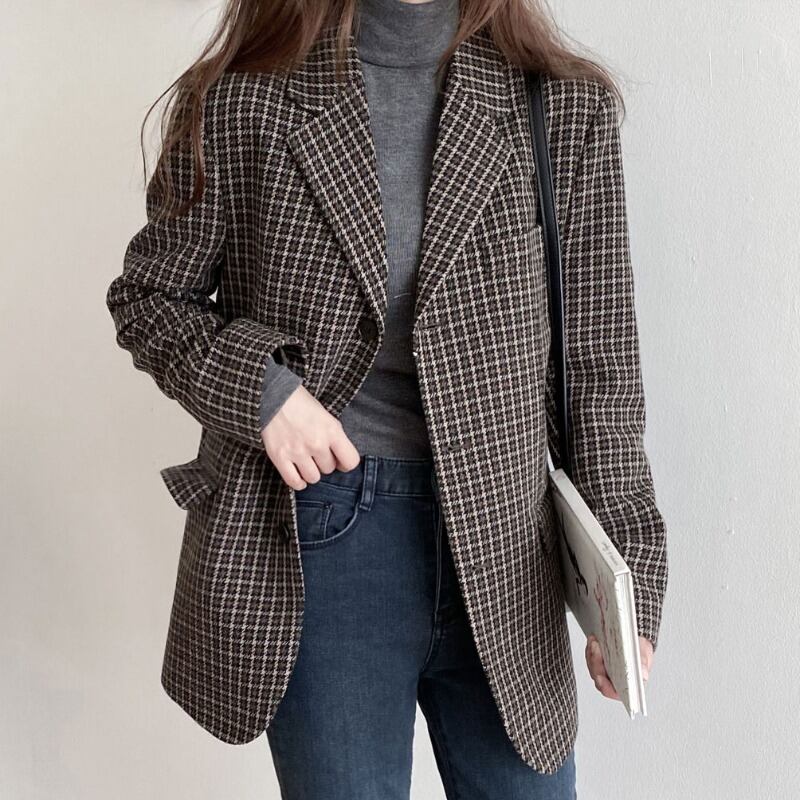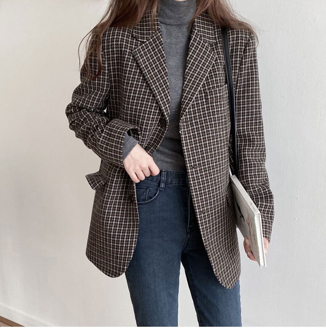 オータムウィンタースタンダードルーズポケット格子柄コート ジャケット レディース ロング レトロ 秋物 冬物 ICC_レディース45707664125