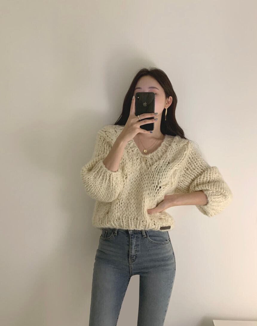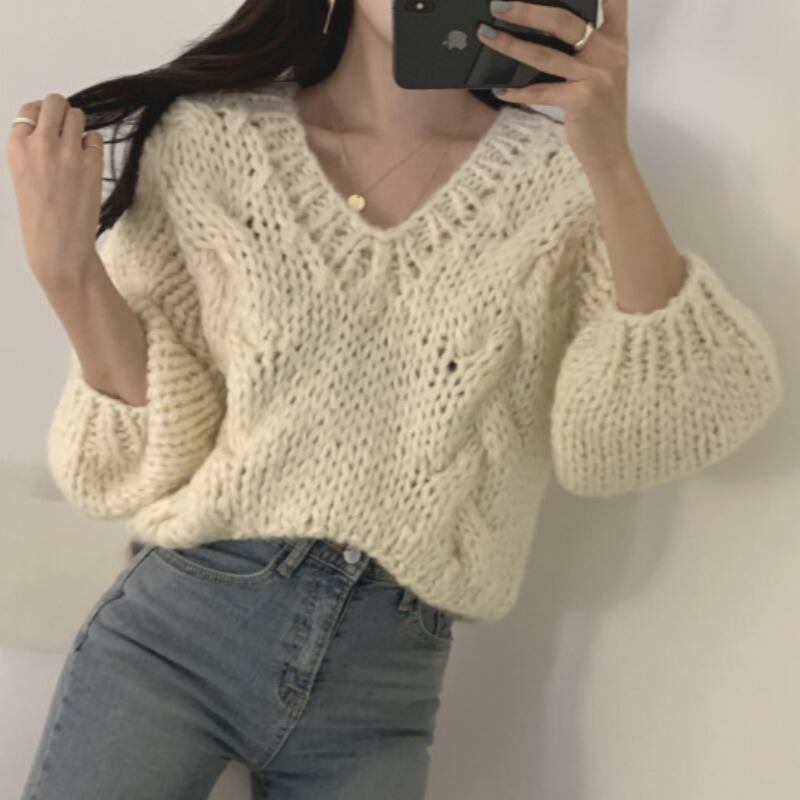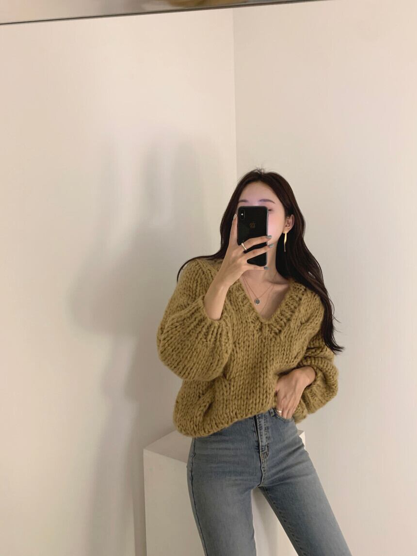 オータムウィンタースタイルスタンダードVネックブラウス ニットプルオーバー セーター レトロ 秋物 冬物 ICC_レディース95008435071