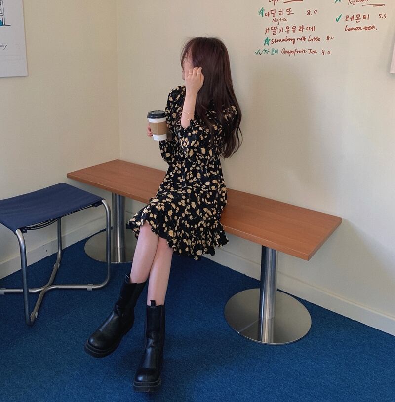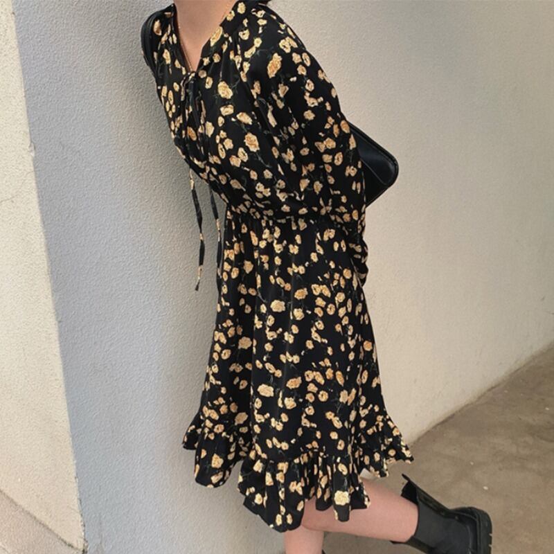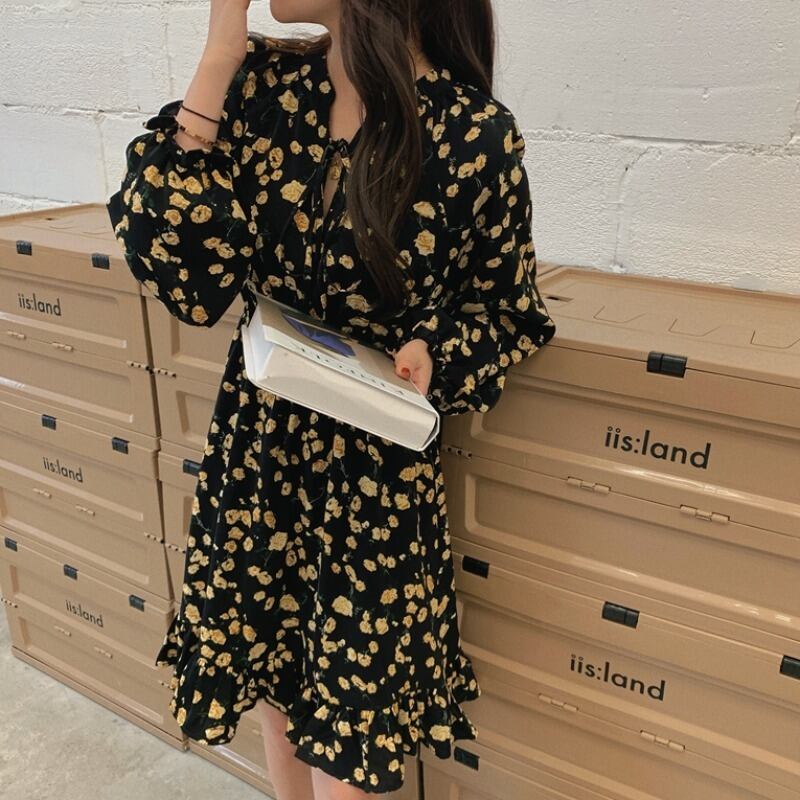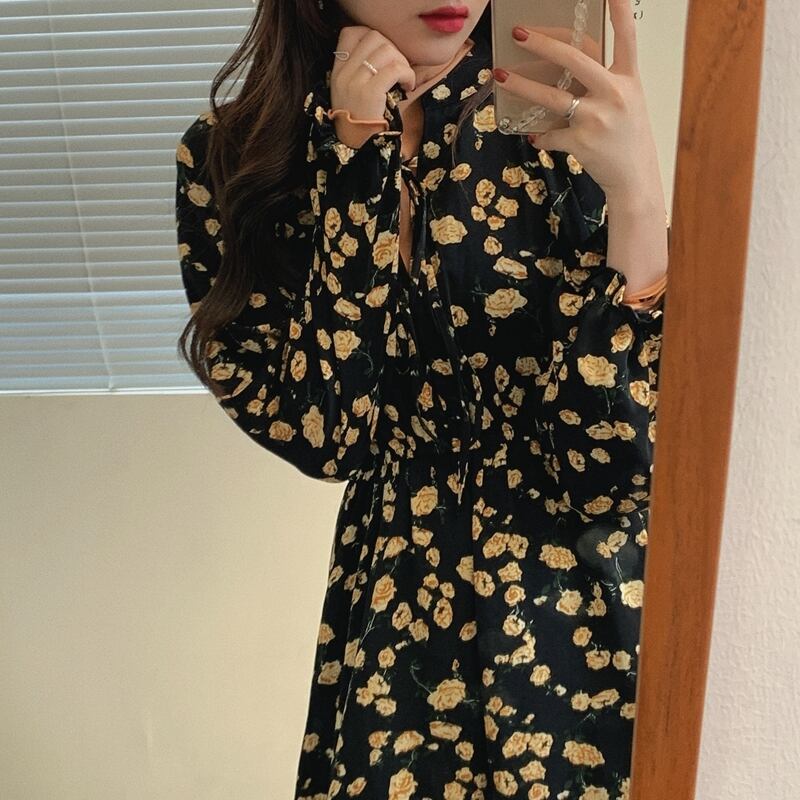 オータムウィンタースタンダードブラックイエローVネックウェストフローラルドレス レディース レトロ 秋物 冬物 花柄 ICC_レディース13715764354
