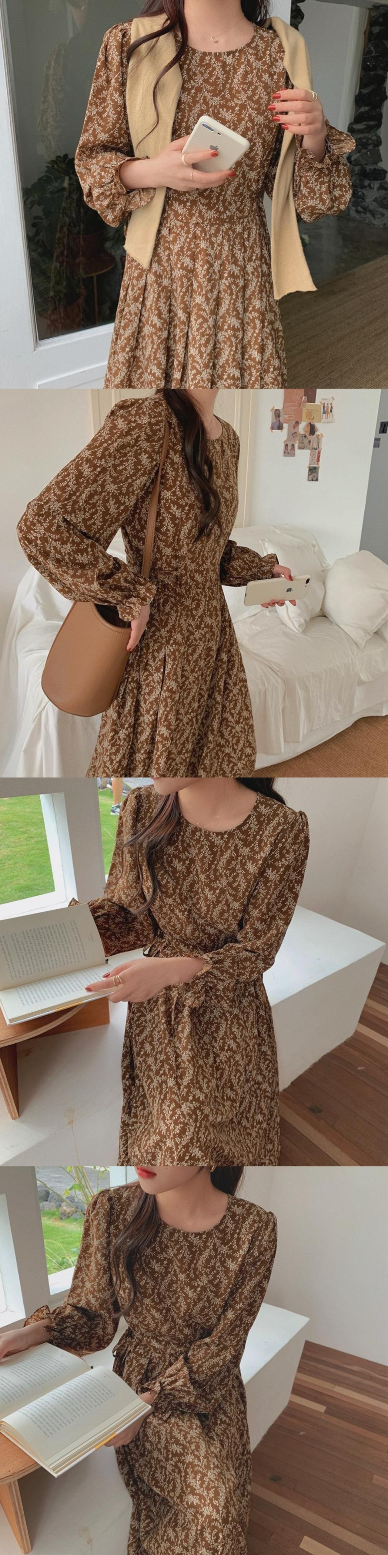 シフォンフローラルドレス オータムスタイルラウンドネックウェストギャザースカート 秋物 花柄 Oネック ICC_レディース27797976697
