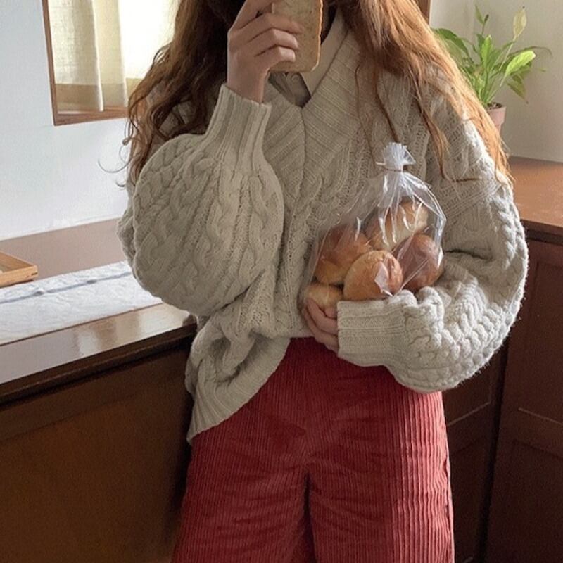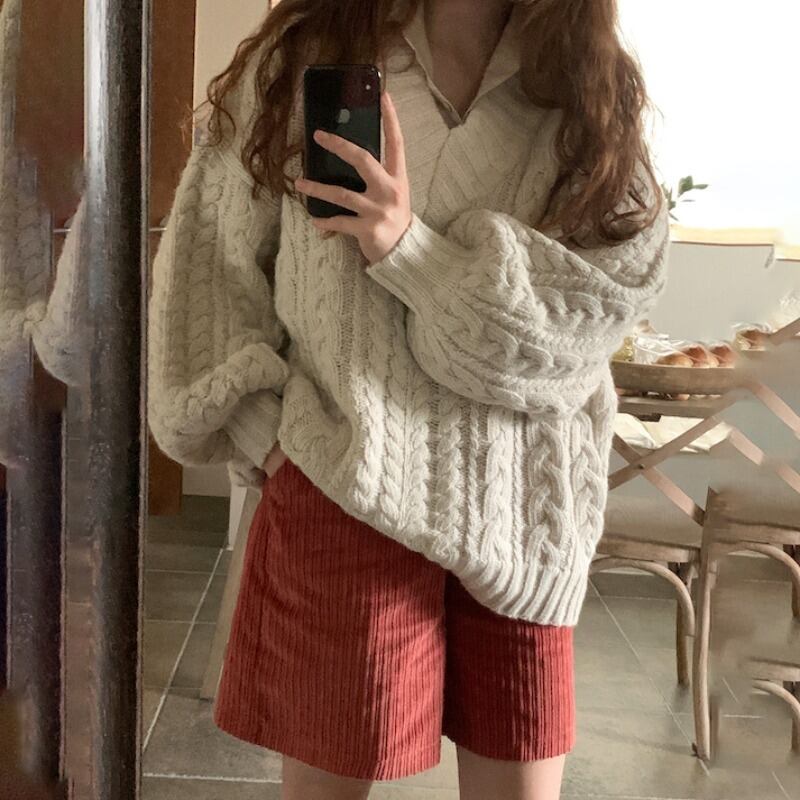 オータムウィンター薄手Vネックパターンスリーブセーター ハイウェストウェストコーデュロイスカート ランタンスリーブ ストリート 秋物 冬物 ICC_レディース73327992810