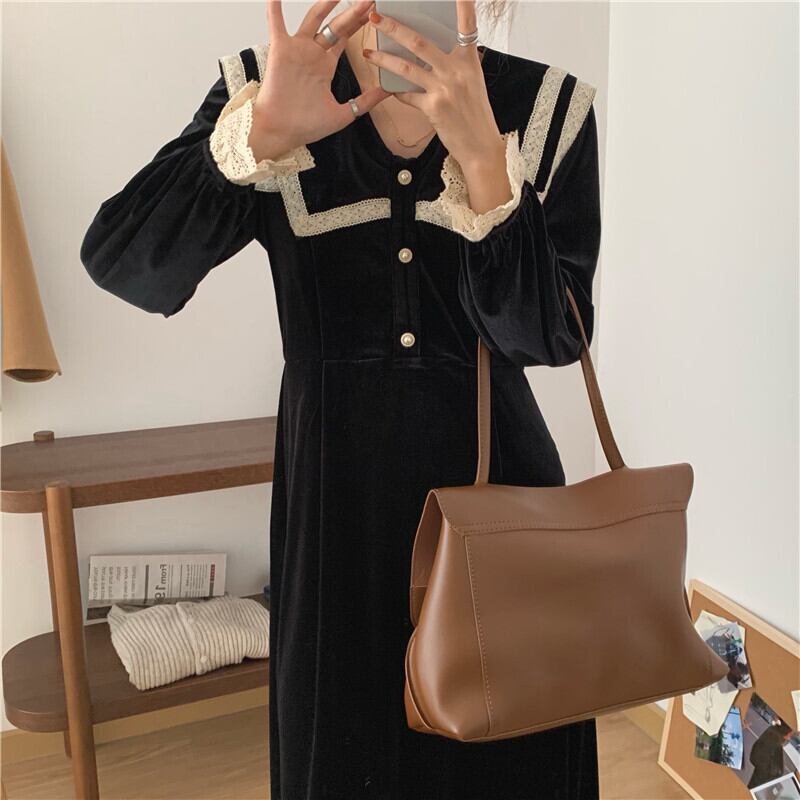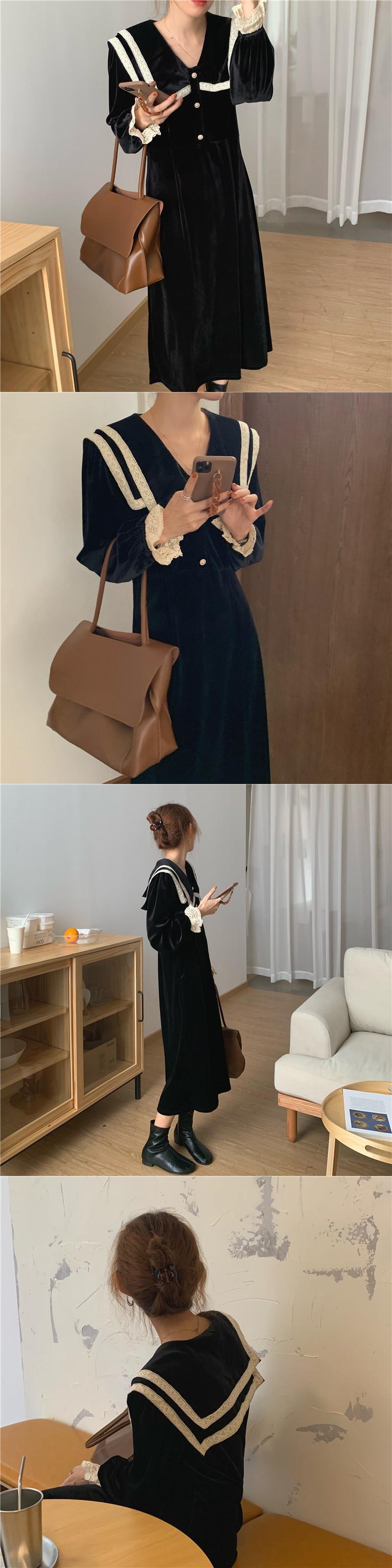オータムウィンターレースパールボタンハイウェストウェストスリーブベルベットドレス ブラック レッド エレガント 秋物 冬物 真珠 ICC_レディース92724180449