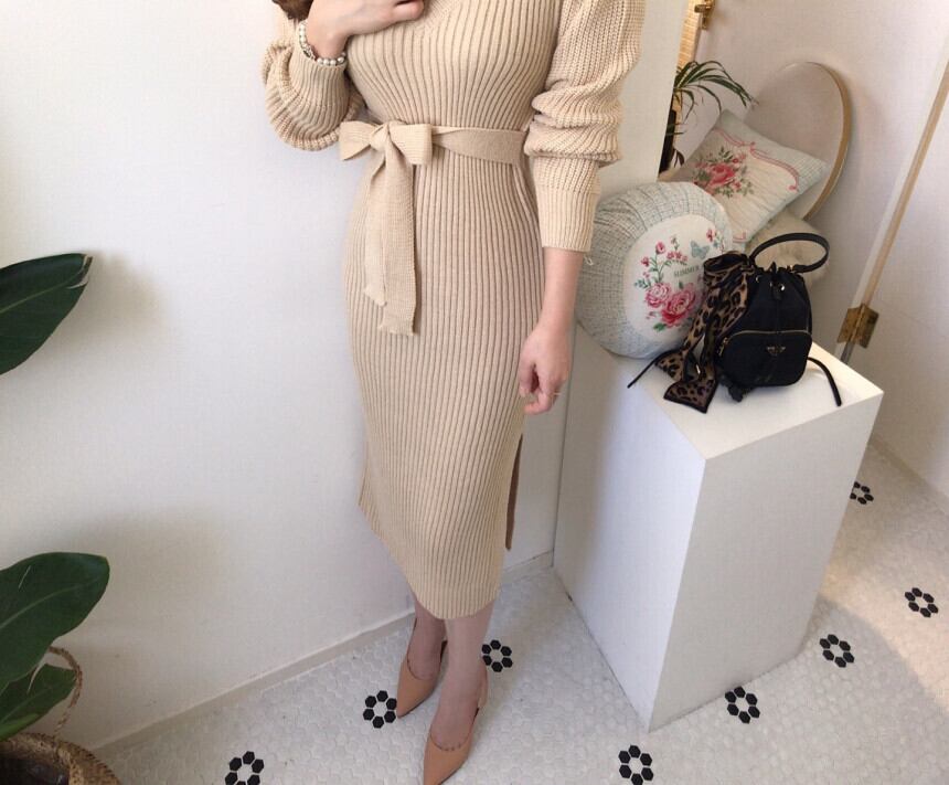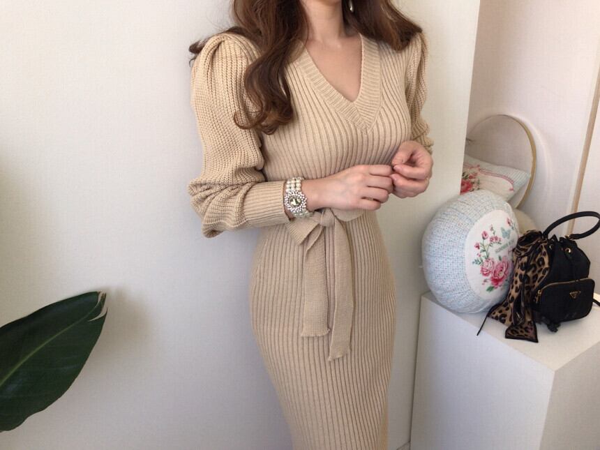 スタンダードスタイルVネックウェスト薄手ロングスリットニットドレス レトロ レース レースアップ ICC_レディース18561449066