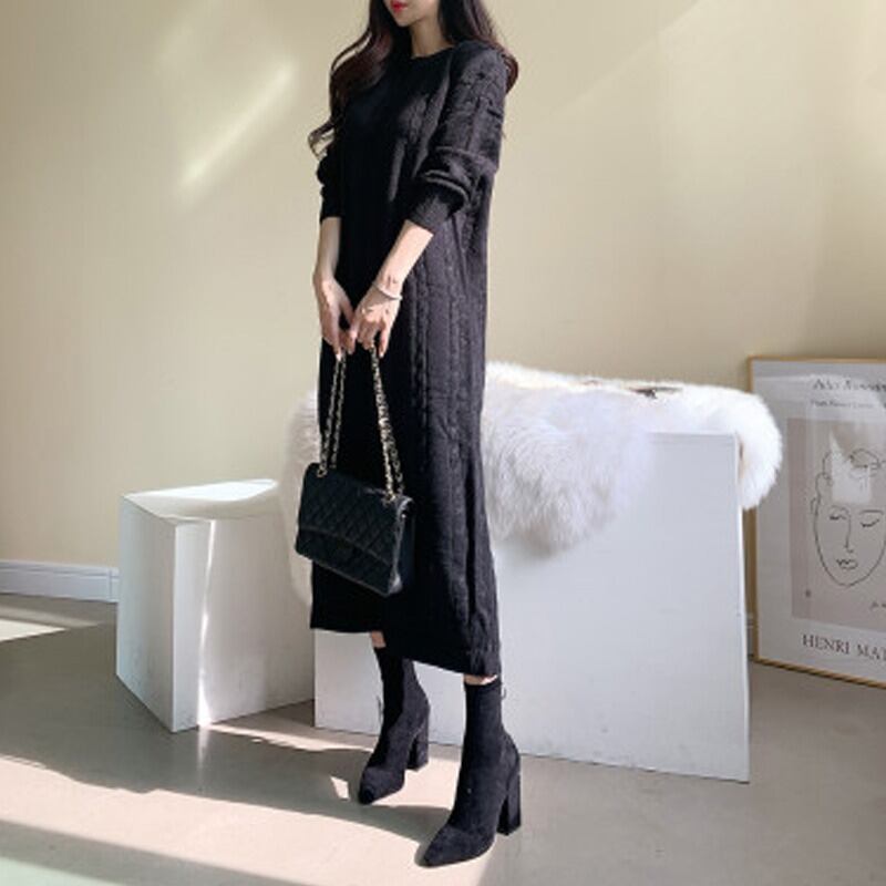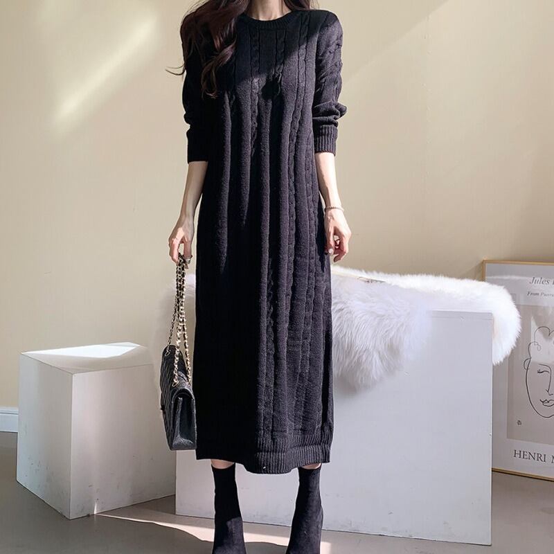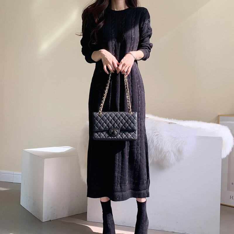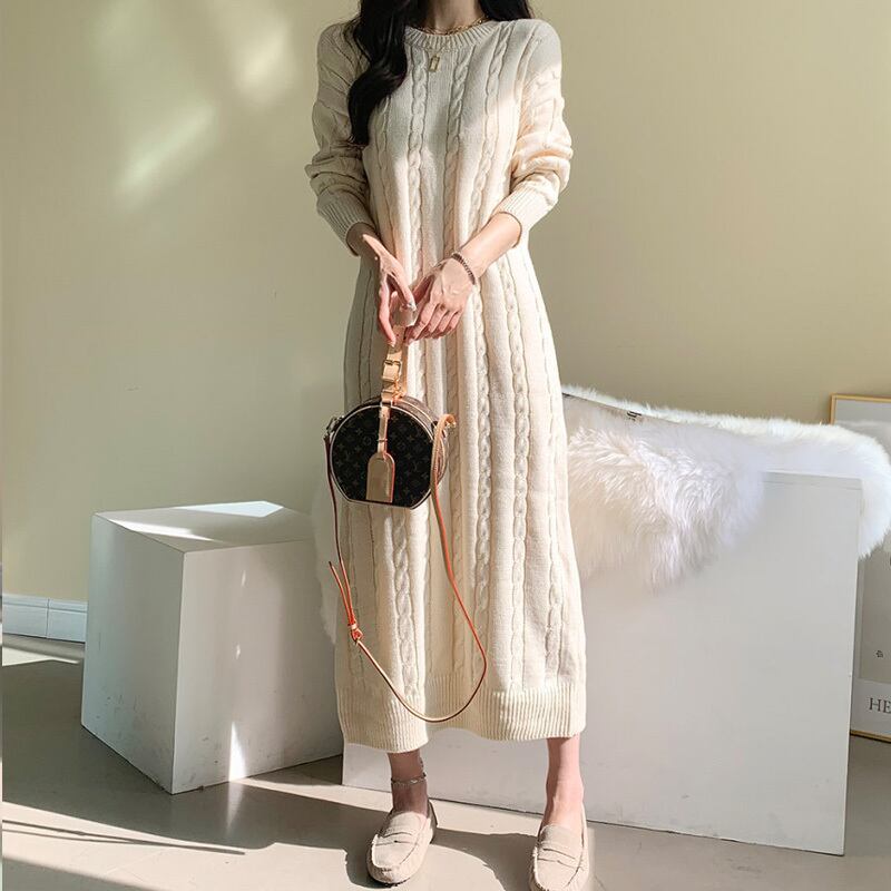オータムウィンターラウンドネックパターンロングニットセーター スカート ドレス レディース エレガント 秋物 冬物 Oネック ICC_レディース90269878232