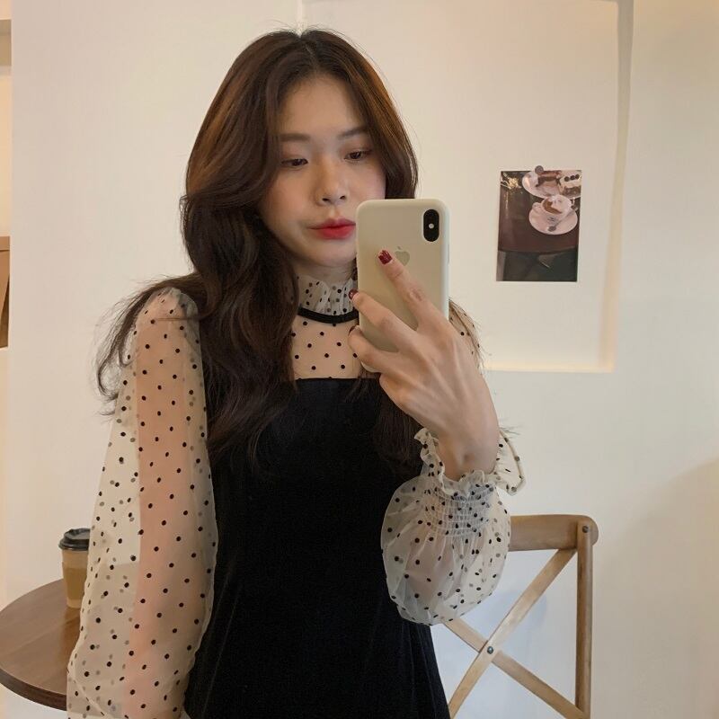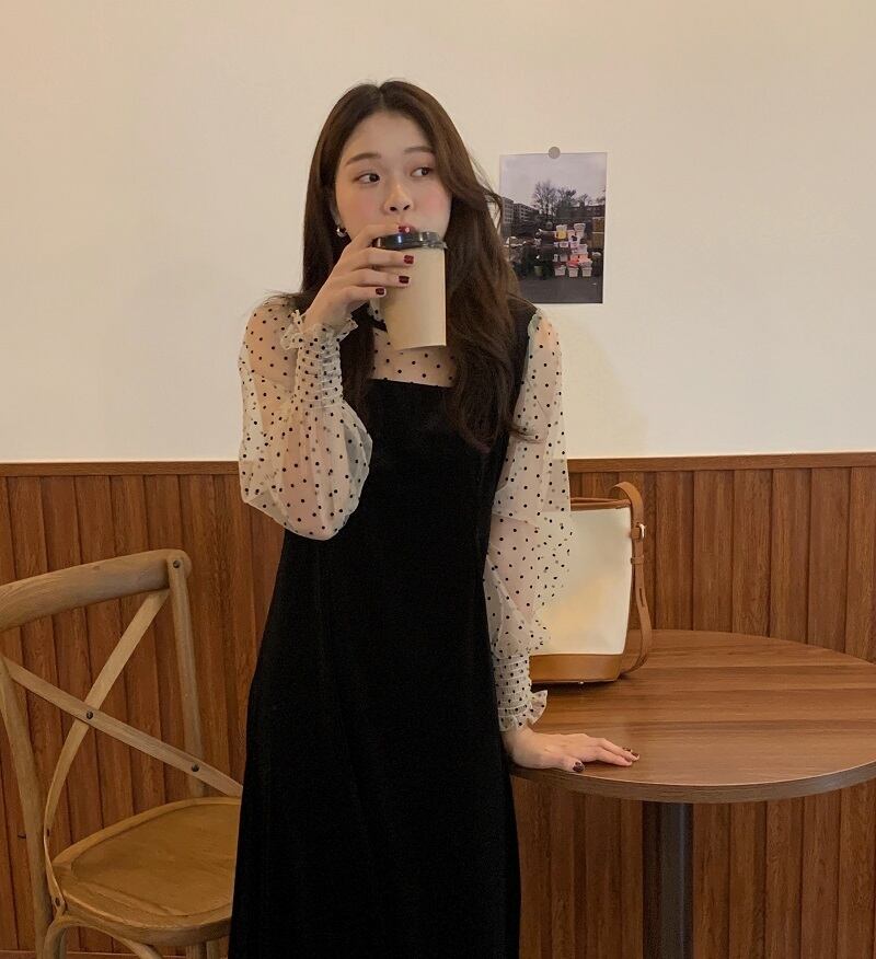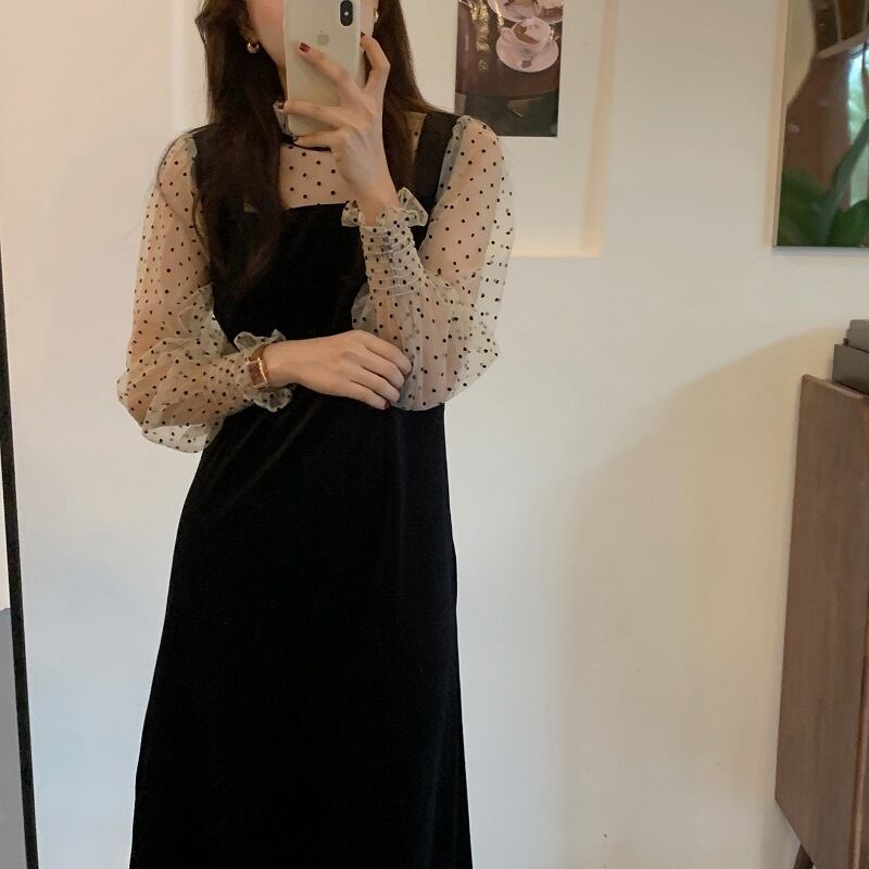 カラー水玉メッシュベルベットスリーブツーピース薄手ブラックドレス ステッチ ICC_レディース60965832930