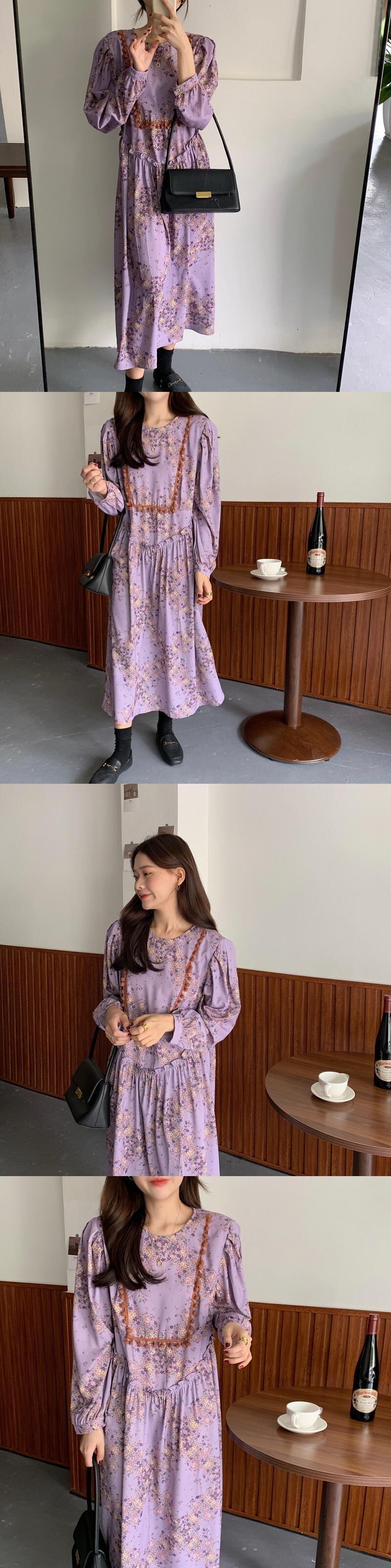 オータムウィンタースタンダードスタイルカラーフローラルルーズ薄手スリーブロングドレス レトロ 大人ガーリー スウィート キュート カジュアル 秋物 冬物 花柄 ICC_レディース19394495107